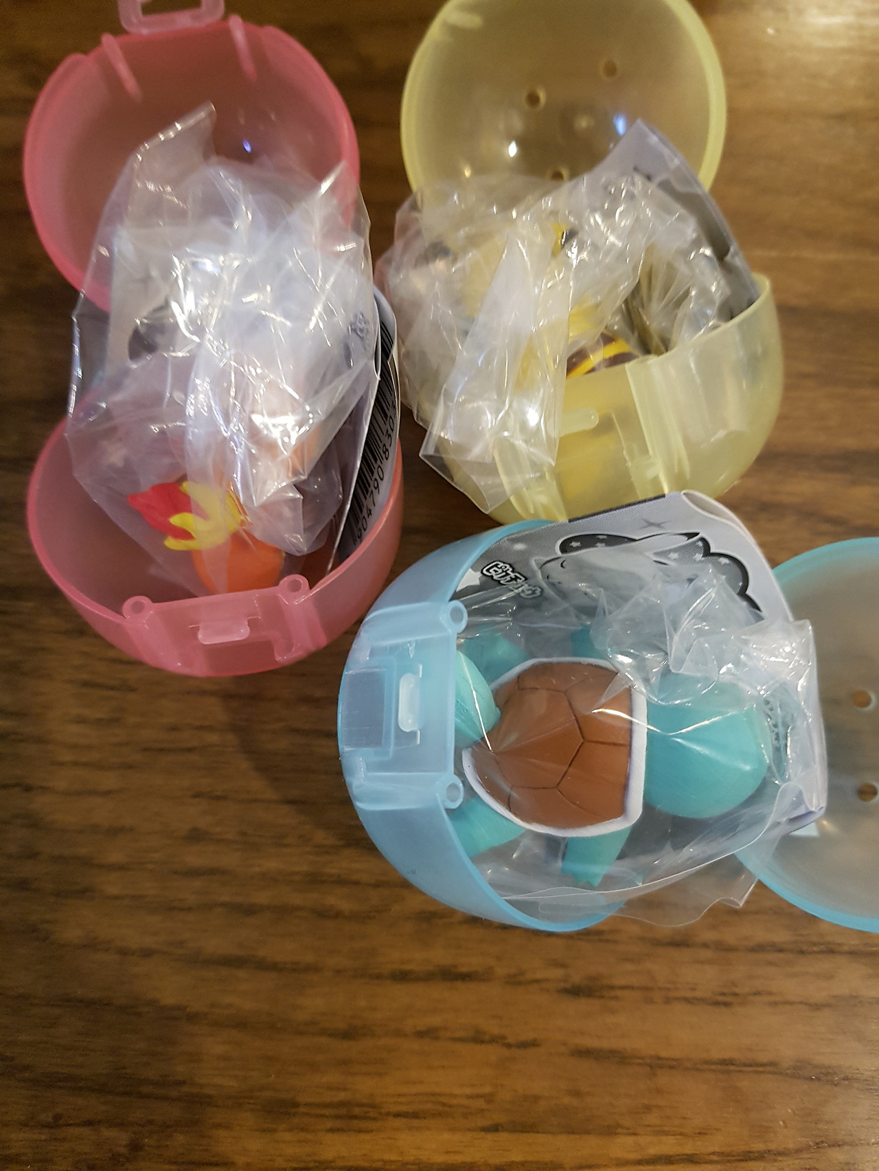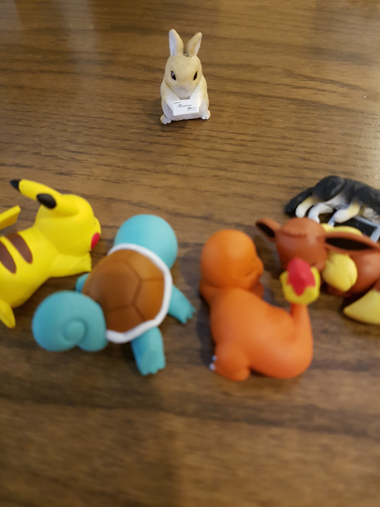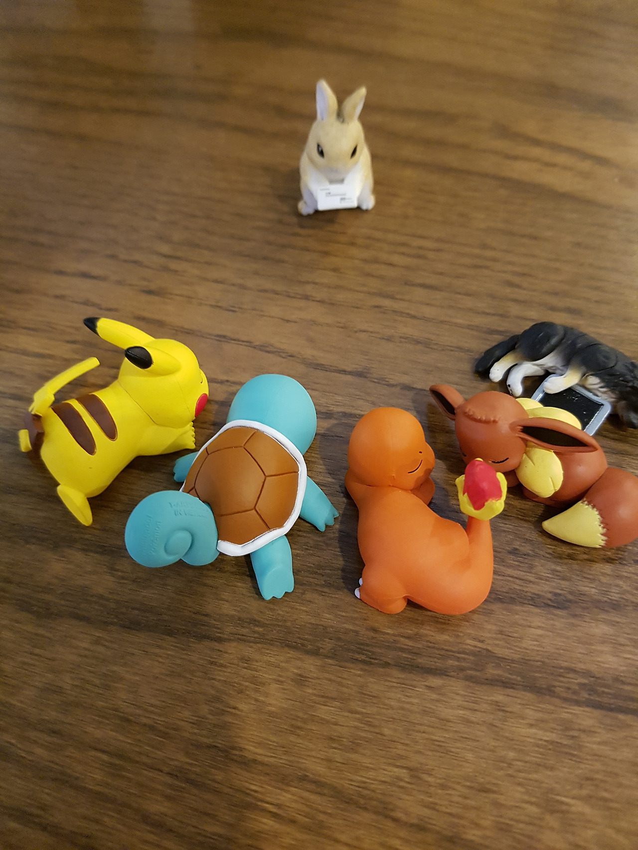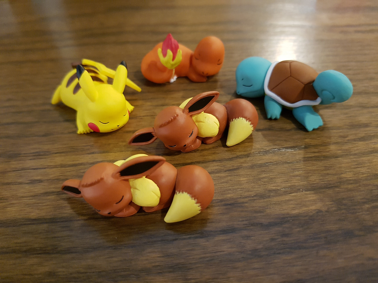 쓸모없는 잠자는 이브이 세 마리 득템. 메모지 홀더로 쓰라는데 그건 위의 포켓몬으로도 충분히 쓸 수 있다고. 너는 왜 잠꾸러기 포켓몬 시리즈에 들어있지 않고 여기 있는 거니. 길을 잃었니? 내가 게임이었으면 주저하지 않고 세 마리를 모았을 거다. 이브이는 각각 물 불 전기 속성으로 진화시킬 수 있거든*. 그런데 너희는 안되잖아? 이런 쓸모없이 귀엽기만 한 놈들...