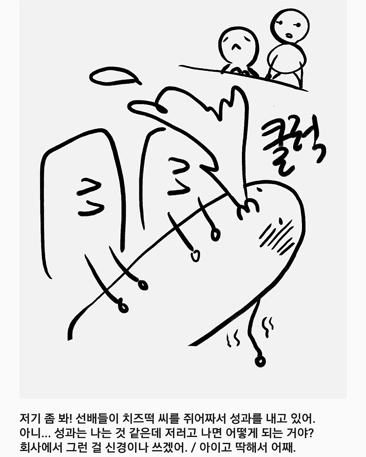 저기 좀 봐! 선배들이 치즈떡 씨를 쥐어짜서 성과를 내고 있어.