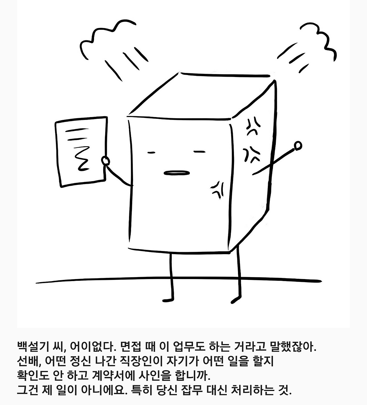 백설기 씨, 어이없다. 면접 때 이 업무도 하는 거라고 말했잖아.