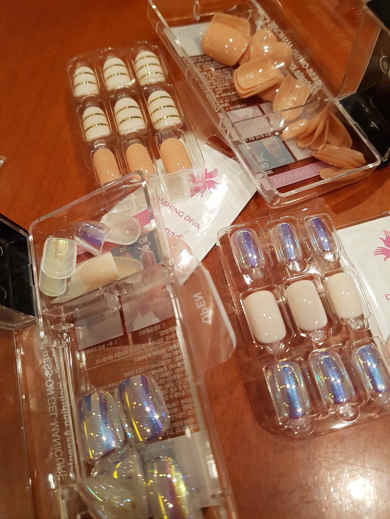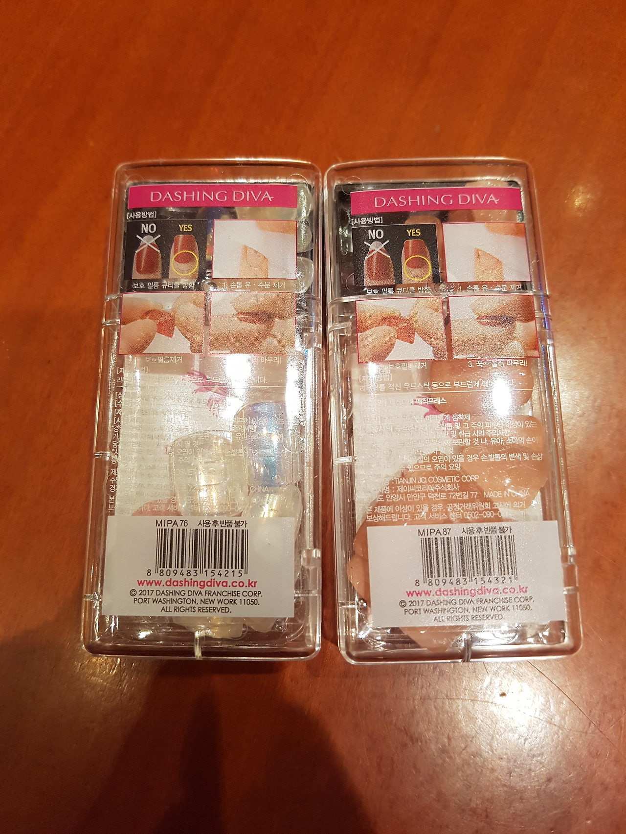 다시 본론으로 돌아와서. 데싱디바 두 통을 개봉했다. 한 통에 네일아트가 새겨진 네일팁 30개가 들어 있다. 나 같이 백화점에 가서도 코디할 자신이 없어 "마네킹이 입고 있는 대로 주세요"라고 하는 사람에게 다른 디자인의 두 통을 조합한다는 건 그야말로 상상 불가능이었는데 센스 있는 친구가 컬러 매치를 기똥차게 해줬다.