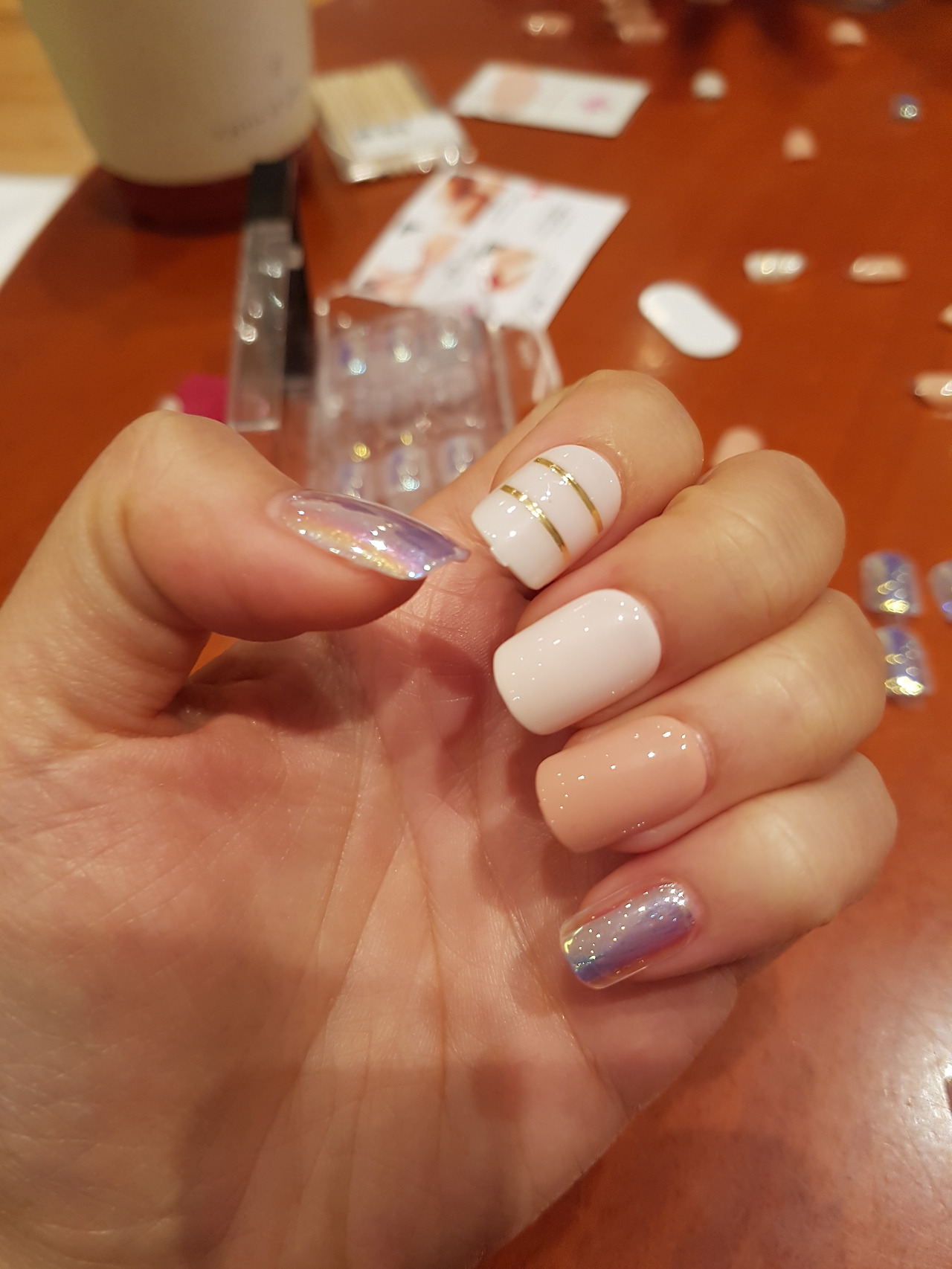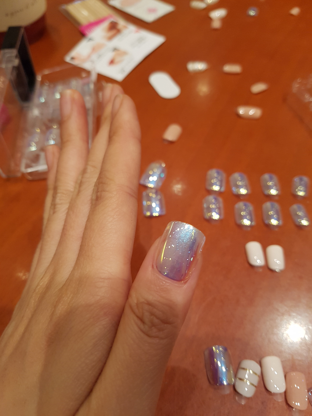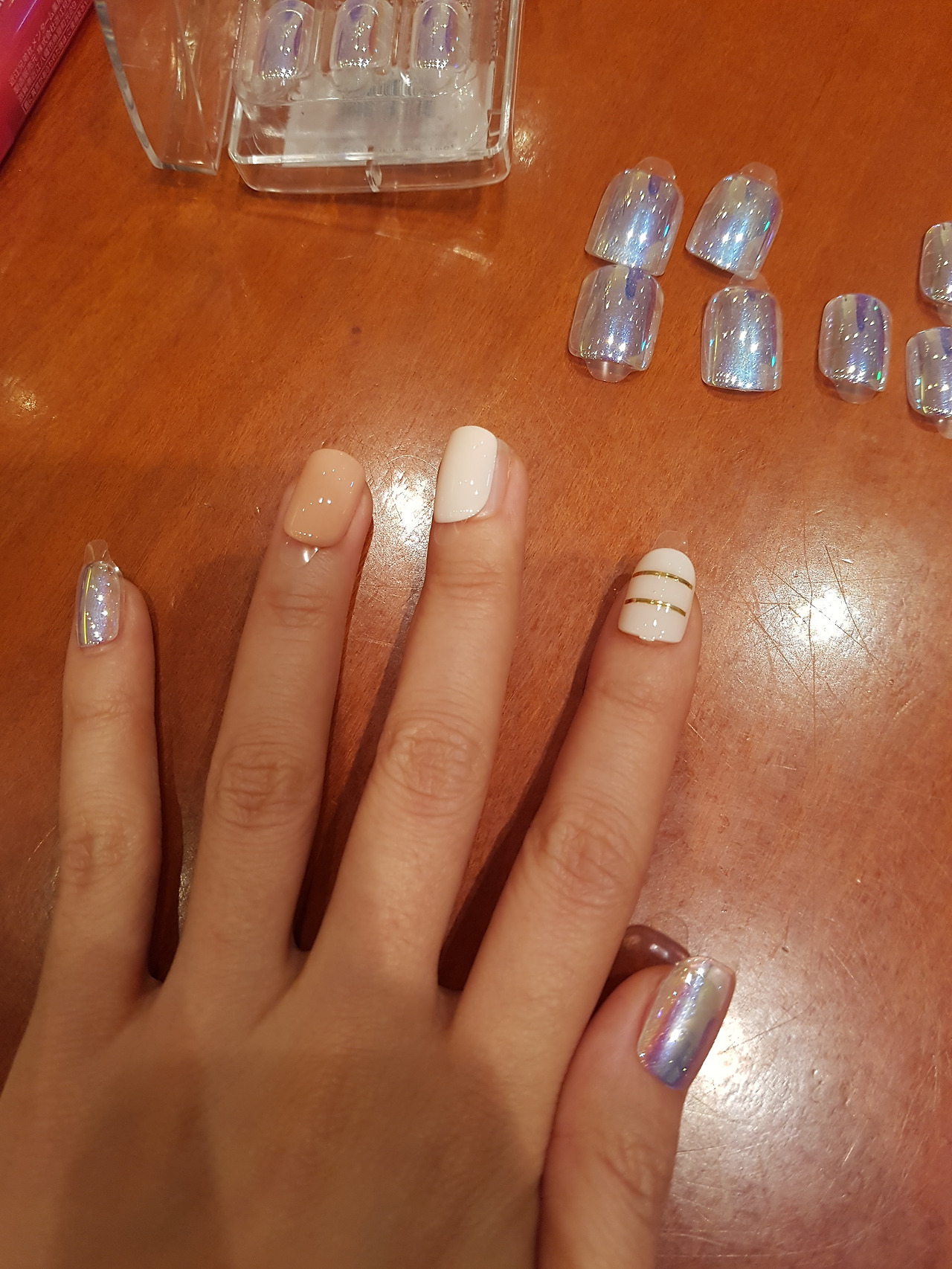 최고 장점은 쾌속으로 네일아트를 완성할 수 있다는 점과 오른손에도 비뚤지 않게 붙일 수 있다는 점이다. 왜냐하면 늘 집에서 매니큐어를 바를 때마다 왼손으로 칠한 오른손 손톱은 망했기 때문.