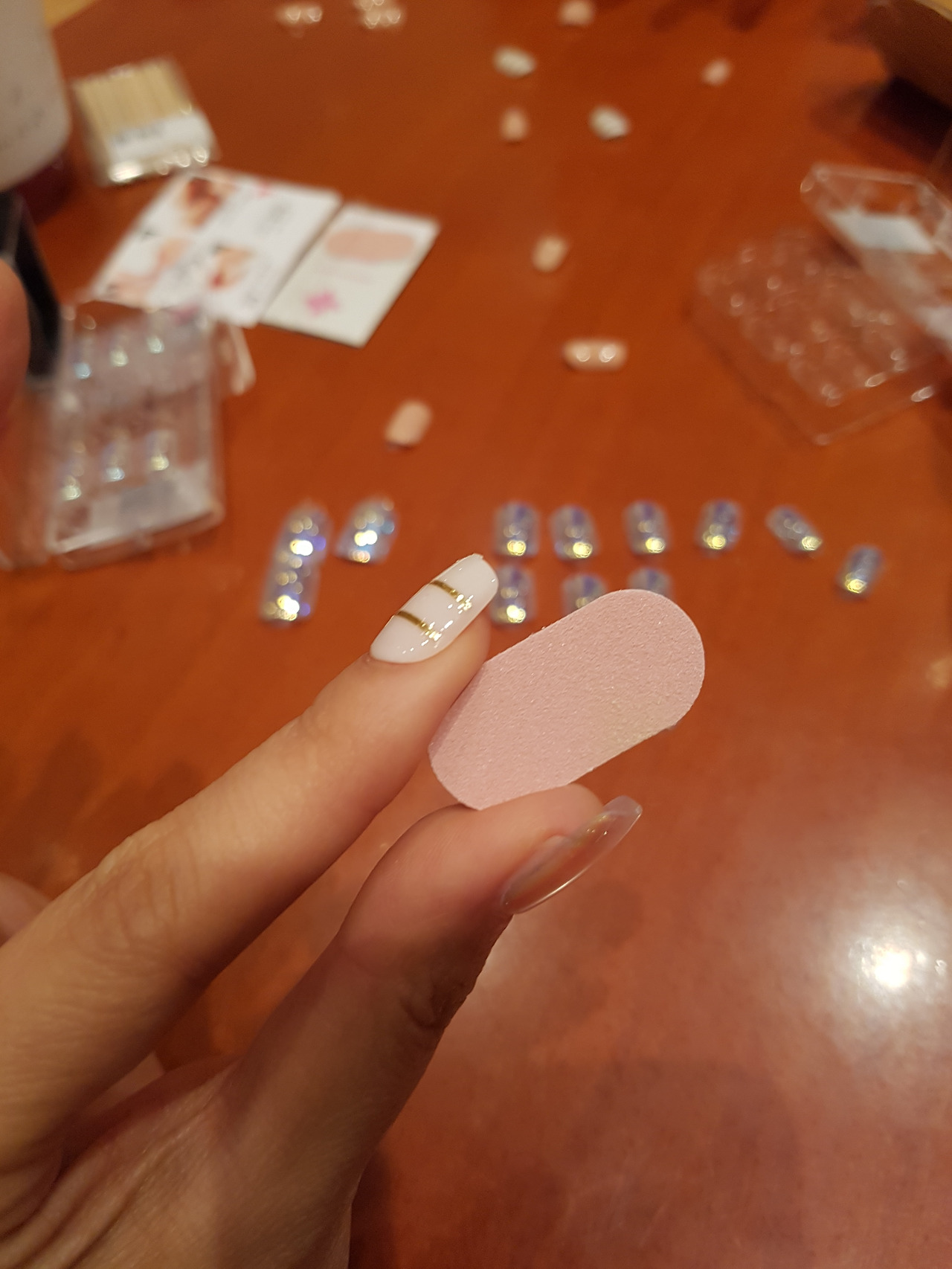 안에 있는 정말 하찮아 보이는 파일로 손톱 끝부분을 갈아서 길이를 조절해주면 되는데 언제 저 손톱만 한 것으로 갈고 앉아 있겠나. 그리고 여러 차례 이 제품을 써보고 내린 결론은 파일로 가는 것보다 손톱깎이로 잘라내고 끝부분만 파일로 다듬어 주는 게 안쪽의 접착제가 밀려 나올 확률도 낮고 더 깔끔하게 정돈된다는 것.