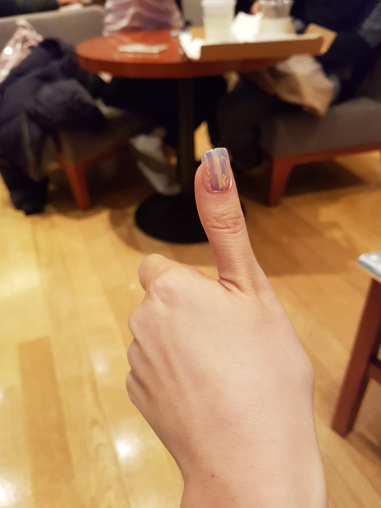 떨리는 손으로 엄지손톱부터 작업 시작. 뒤에 붙은 비닐을 벗겨내고 손톱 모양에 맞춰 꾹 눌러준다. 양면테이프가 붙어있어 손톱에 떡하니 들러붙는다. 꾹꾹 눌러주면 부착이 더 잘 된다.