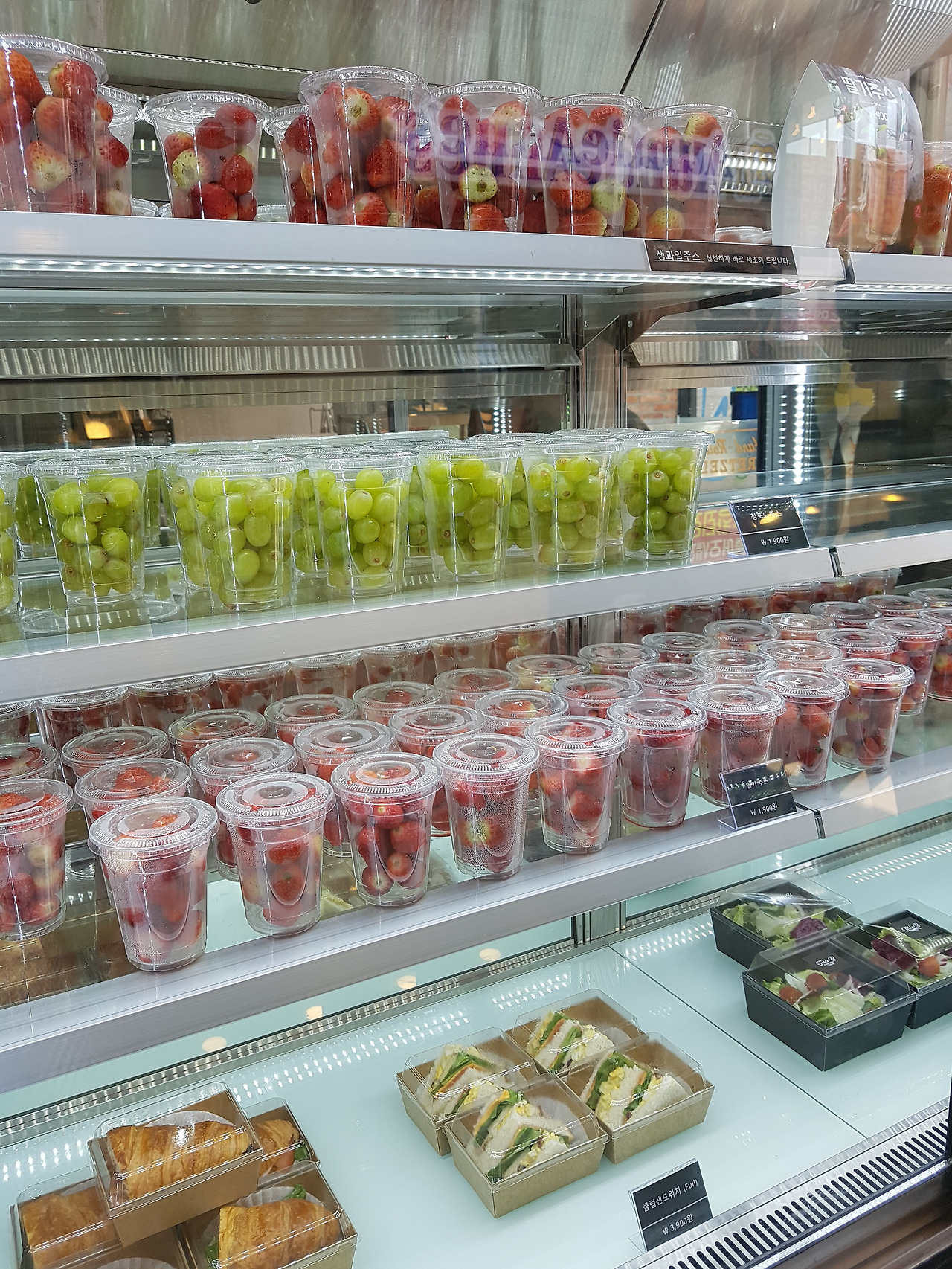 제철 과일을 듬뿍 담은 과일 주스가 1900원밖에 안 한다. 생딸기 넣은 딸기주스가 1900원이라니. 더 마음에 든다. 가볍게 혼밥 할 사람들을 위해 샌드위치도 팔고 있다.