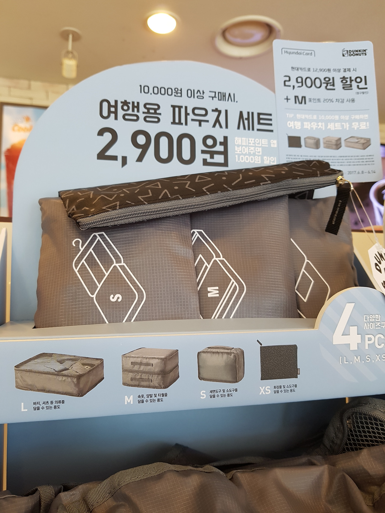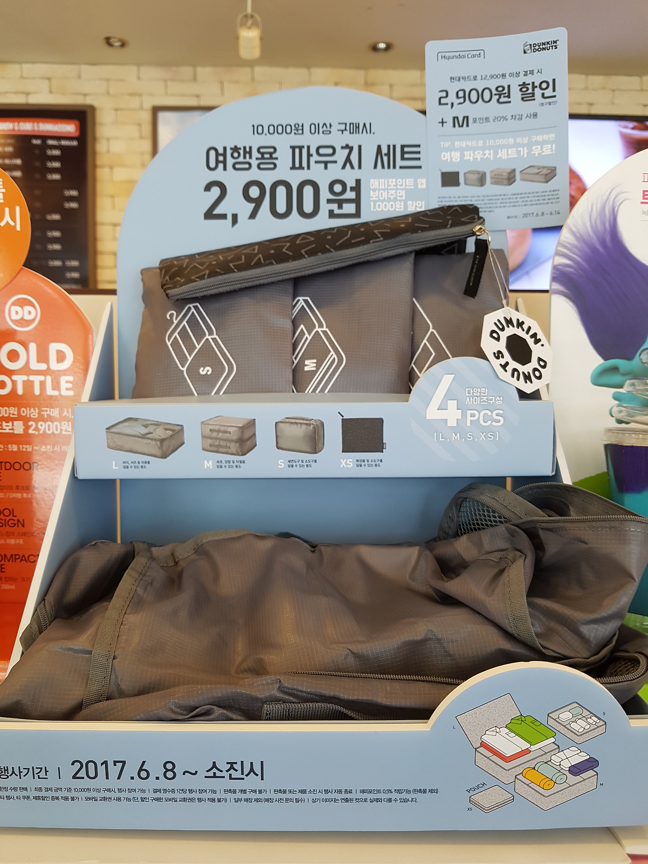 그렇게 던킨도너츠에 도착했다. 요즘 보면 던킨도너츠와 알라딘은 본업보다 굿즈 생산에 더 열을 올리는 것 같다. 본격 주객전도 브랜드 양대산맥. 이날 매장에서 여행용 파우치 세트에 대해 문의한 첫 손님이 나다. 지름스퀘어 던킨도너츠 여행용 파우치 세트 파운더가 되셨습니다.