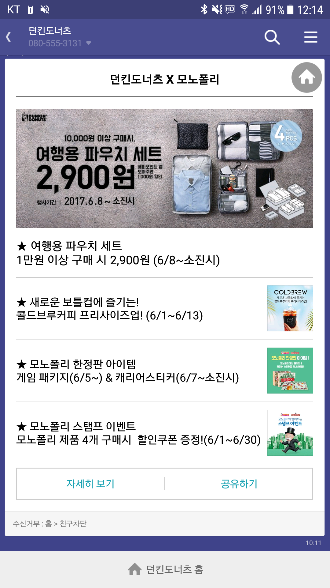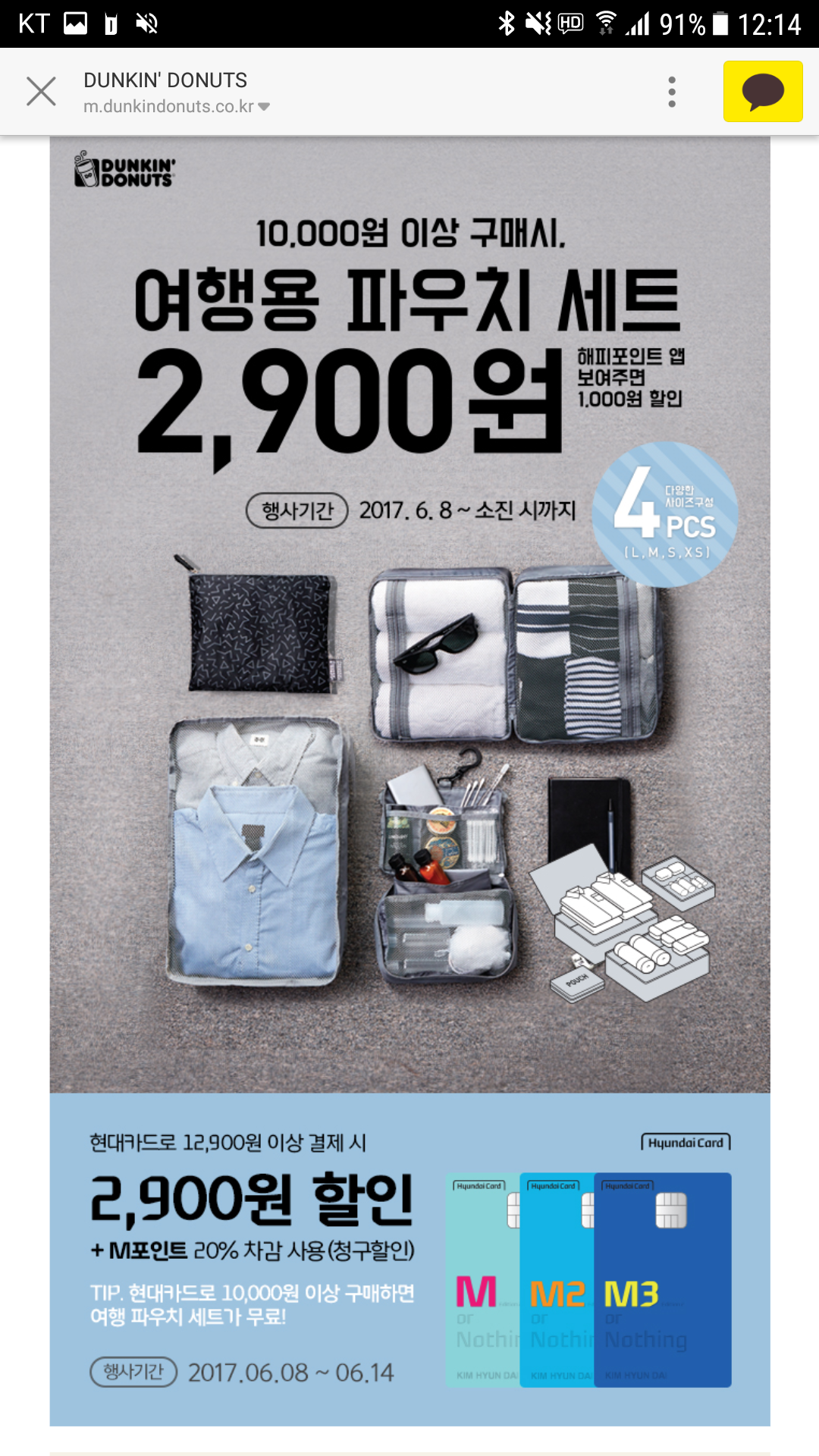 카카오톡에서 나는 던킨도너츠와 친구사이다. 이 친구는 소통이 부족한 타입이라 내 이야기는 들어주지 않으면서 자기 얘기만 한다. 도도해서 메시지를 되게 가끔 보내준다. 그래도 그때마다 솔깃할 때가 많아서 지는 느낌. 오늘도 졌다. 오늘 점심은 던킨도너츠에서 먹는다. 왜냐하면 던킨도너츠×모노폴리 여행용 파우치 세트를 살 거니까.