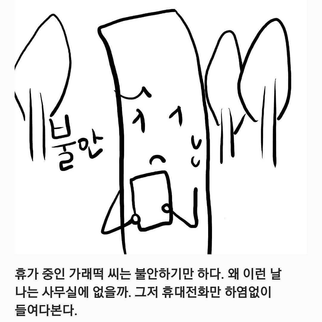 휴가 중인 가래떡 씨는 불안하기만 하다. 왜 이런 날 나는 사무실에 없을까. 그저 휴대전화만 하염없이 들여다본다.