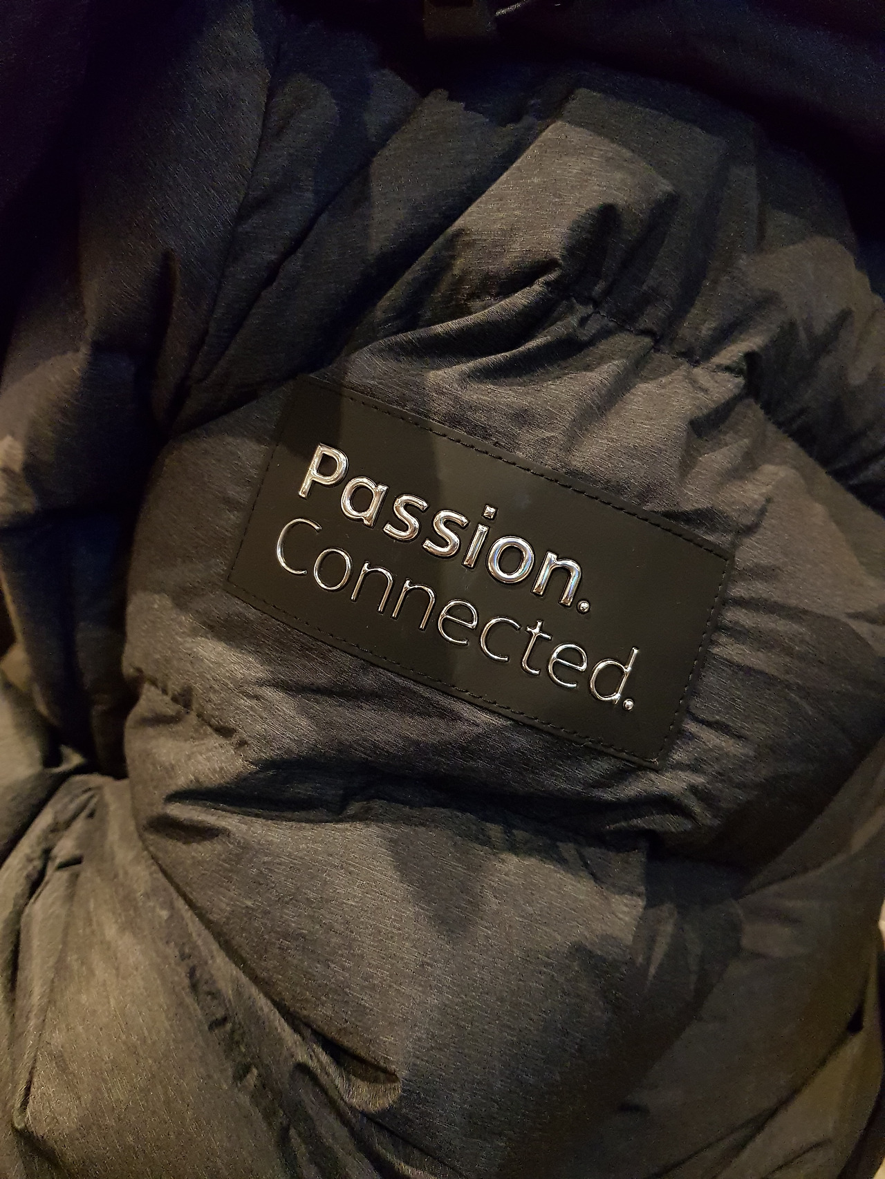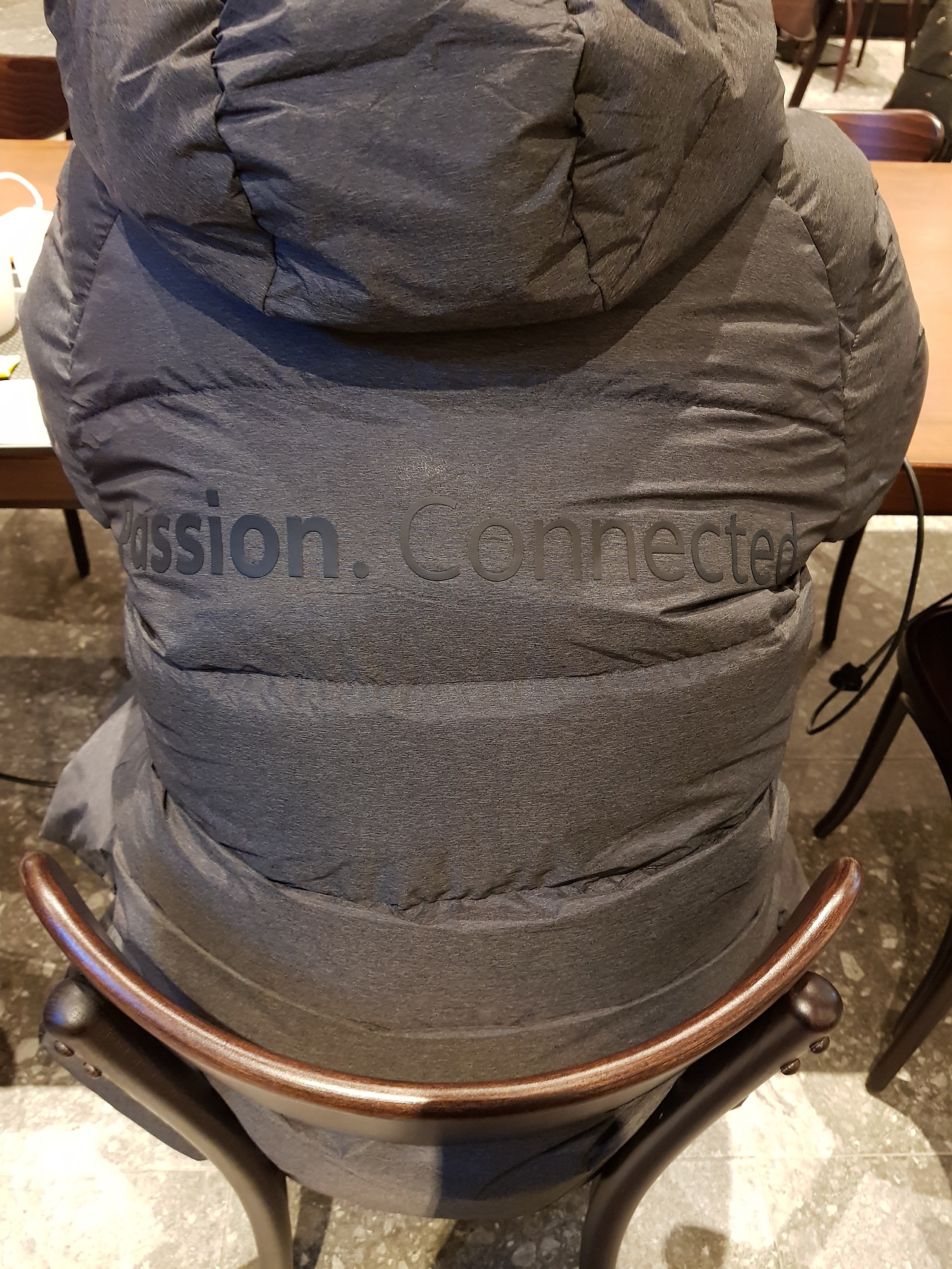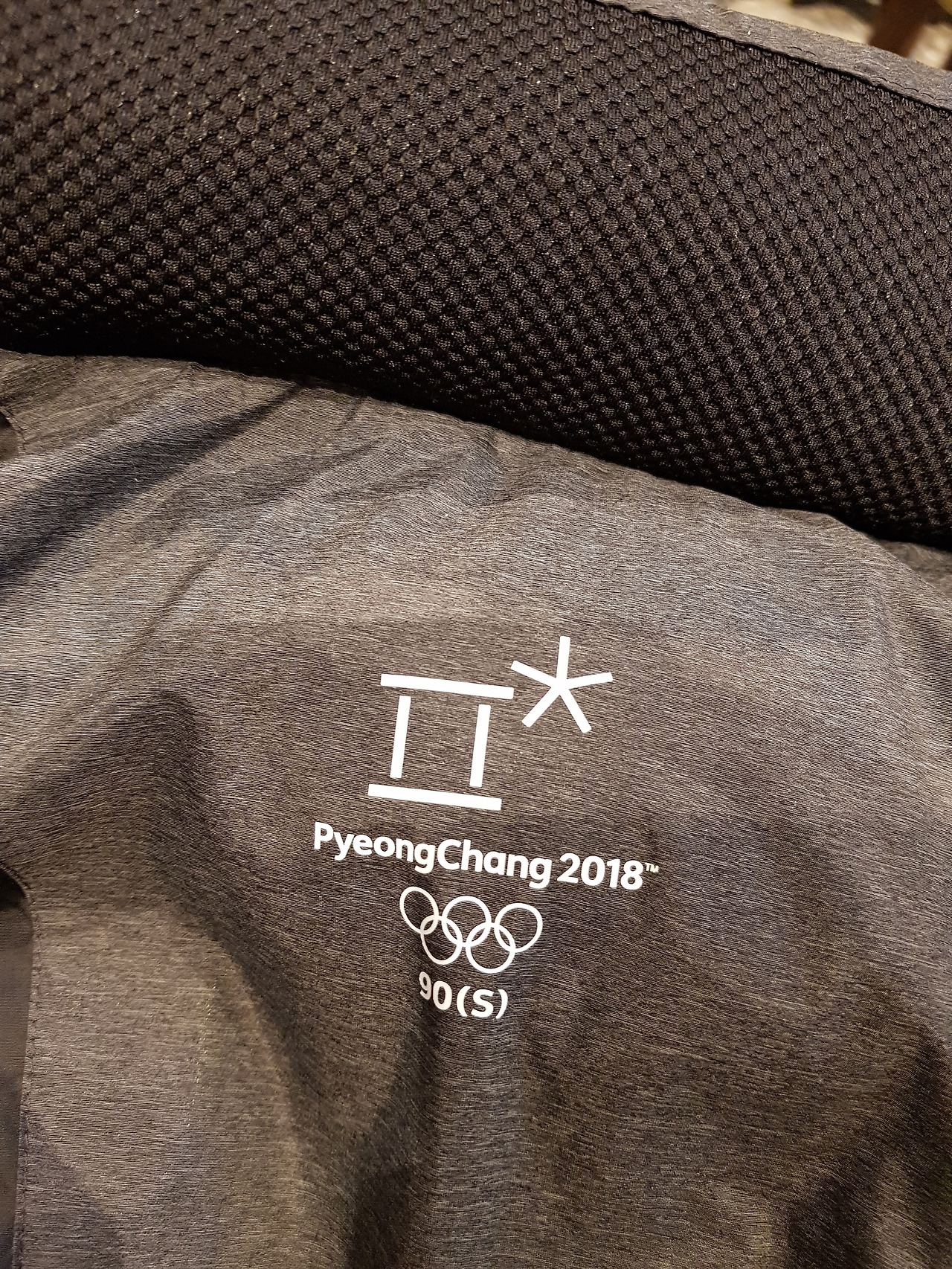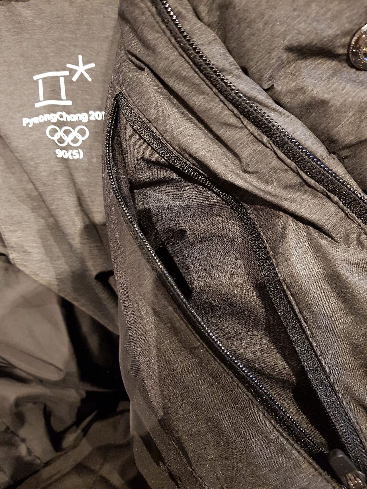 평창 올림픽의 공식 슬로건인 패션 커넥티드(Passion Connected, 하나의 열정)' 로고가 팔뚝과 등에 박혀 있다. 개인적으로 입으면 강제로 그 브랜드 입간판이 되어버리는 패딩이나 외투를 좋아하지 않는데 이 제품은 '평창' '파워 평창' '내가 평창이다' 이런 느낌의 문구가 들어있지 않아서 훨씬 세련된 느낌이었다.