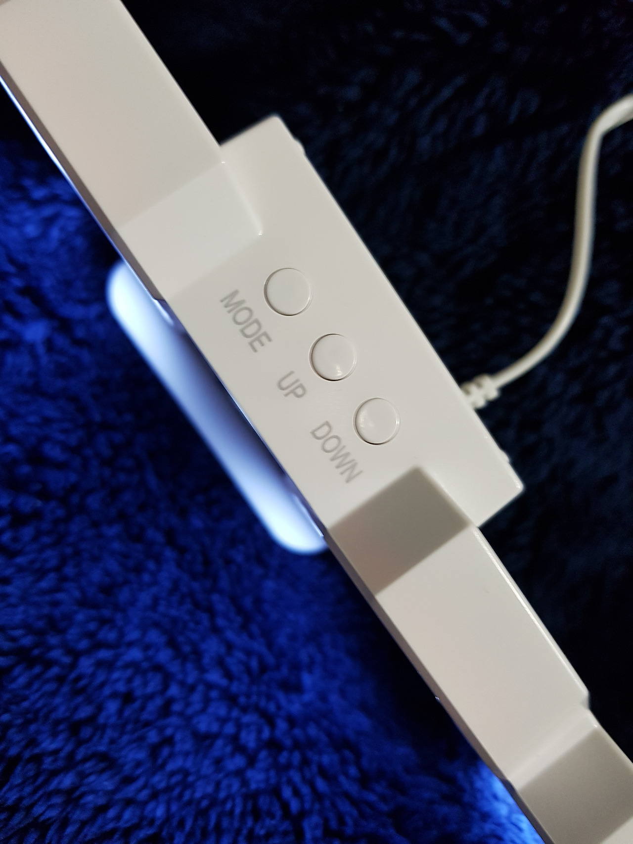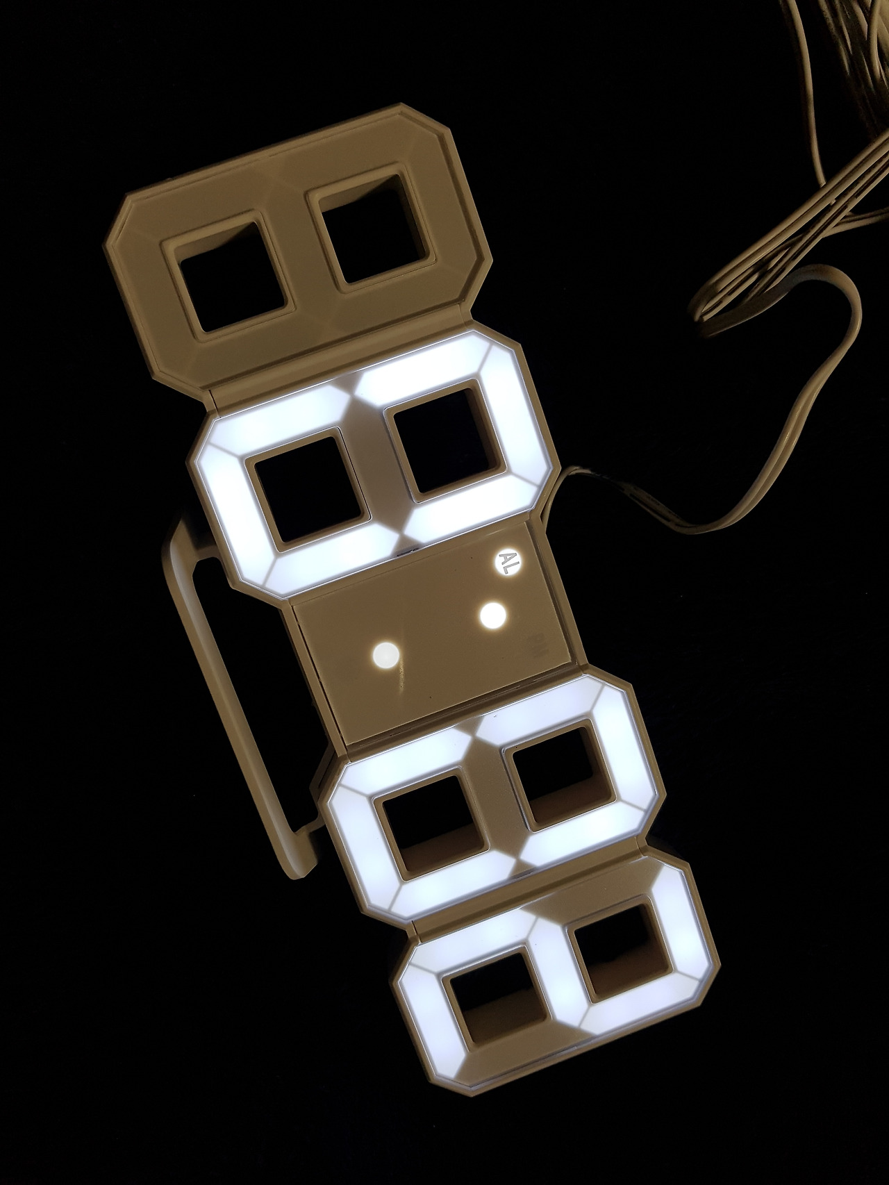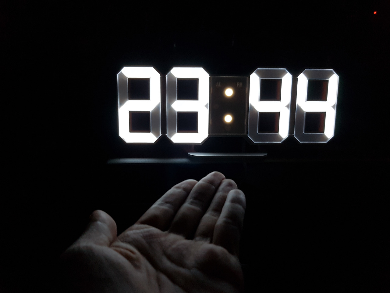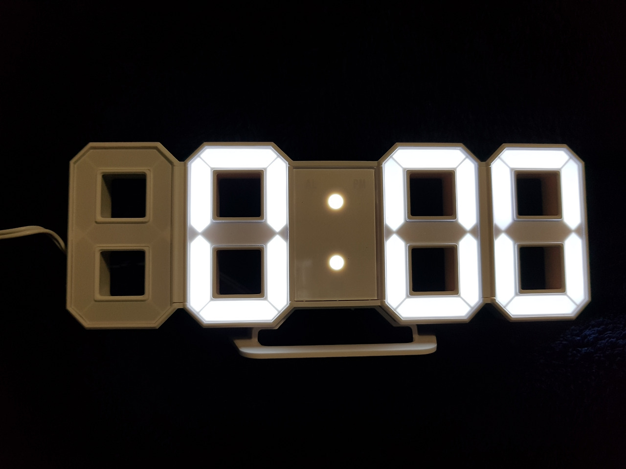 불을 모두 꺼 보았다. 영롱하게 빛나는 LED 시계. 시간 하나는 끝내주게 잘 보인다. 이 시계의 최고 장점은 시간이 매우 잘 보인다는 것이고 최고 단점은 아주 밝다는 것이다. 또 다른 리뷰에서는 잘 때 수건을 덮어놓고 잔다는 내용도 있었다.