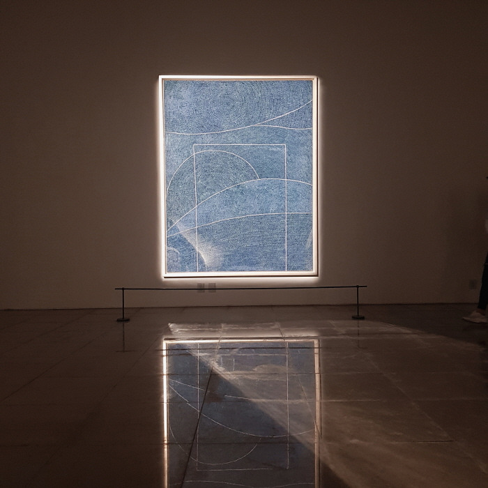 신관 지하에는 한국 미술품 최고가를 갱신한 故 김환기 작가의 그림이 전시되어 있다. 그는 서양의 추상화를 도구로 한국의 미와 정서를 표현했던 화가로, 이번 전시에서는 한국 회화사의 기념비적인 작품인 <십만 개의 점 04-VI-73 #316>이 개관 이래 처음으로 관객을 찾는다. 다섯 개의 구심점을 따라 찍힌 수 백개의 점들이 마치 수묵화처럼 번져있는 이 작품에는 작가가 평생에 걸쳐 연구했던 조형언어에 대한 열정이 고스란히 담겨 있다. <십만 개의 점>은 새하얀 조명 아래서 마치 바닥에 비친 그림자마저 하나의 작품인 듯, 고고하게 빛을 발한다. 아직 본관은 발을 들여보지도 못했는데 벌써 전시 몇 개를 관람한 기분이 든다.