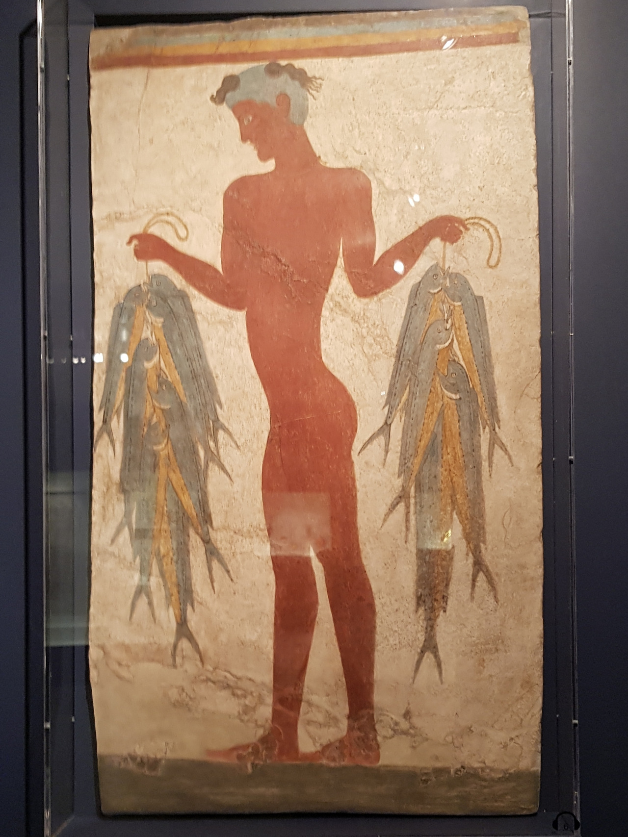 위의 사진은 기원전 16세기 프레스코 벽화로, 테라 섬에 화산이 폭발하면서 파괴된 주택에서 발견되었다. 해양 문명답게 손에는 물고기를 가득 들고 있는데, 이는 크레테 문명이 상업 및 농경뿐만 아니라 수산업과도 밀접한 관계를 맺고 있었음을 보여준다.