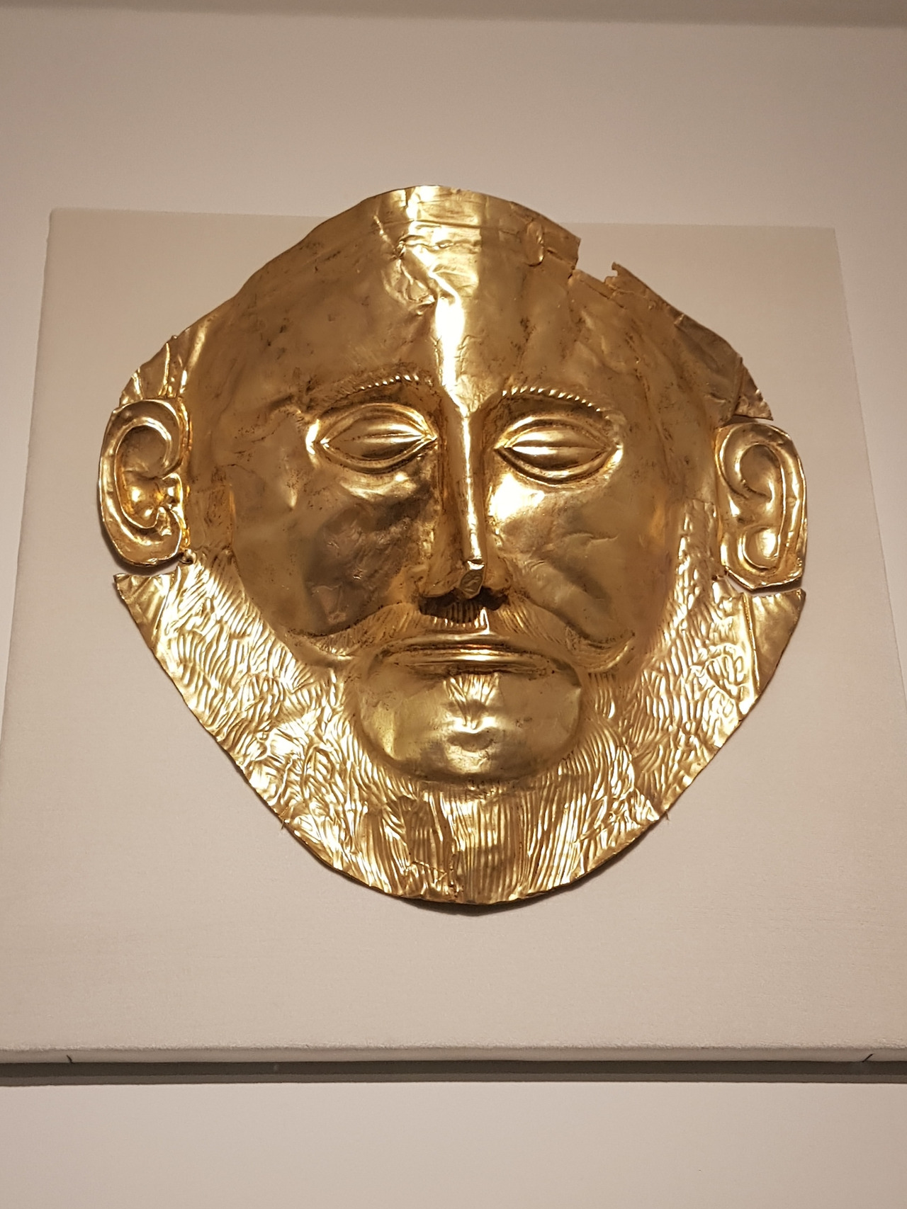 아래의 사진은 호메로스의 <일리아스>에 등장한 장군 아가멤논의 장례용 가면으로 널리 알려져 있지만, 사실은 뮈케나이 왕자의 장례용 가면이다. 이 가면은 뮈케나이 문명이 공고한 계급사회였음을 보여주는 지표이자 영혼의 불멸을 향한 그들의 내세관을 확인할 수 있는 귀중한 유물이다. 고고하면서도 비장한 표정의 황금 가면은 수천 년이 지난 지금까지도 퇴색되지 않은 우아함을 자랑한다. 비록 가면이 정말 아가멤논의 것은 아니지만, 전시회의 제목에 아가멤논이 들어가는 것으로 우리는 이 유물의 가치를 유추해 볼 수 있다.