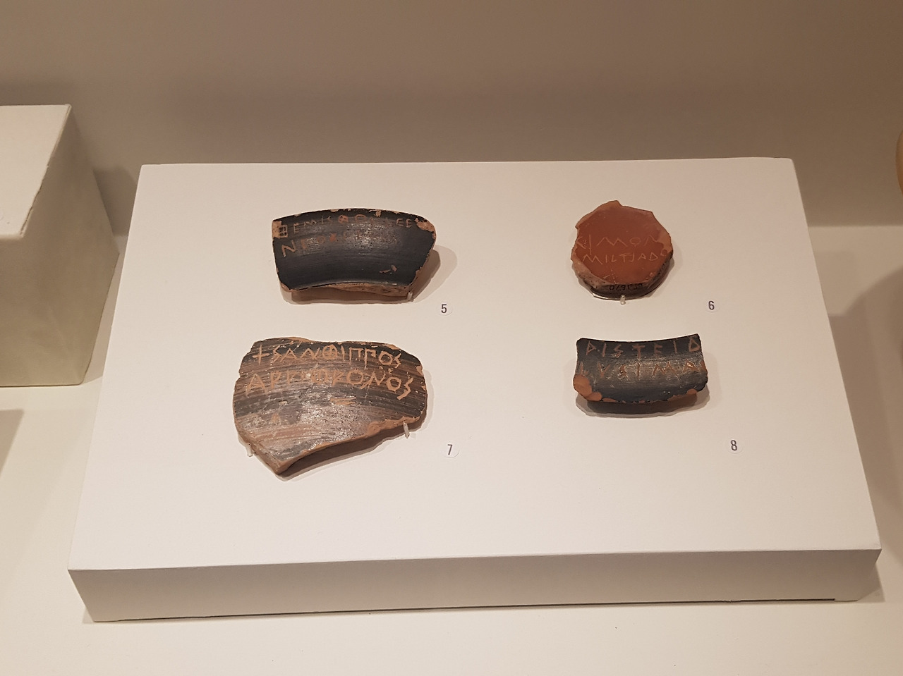 페이시스트라토스의 뒤를 이어 참주가 된 클레이스테네스는 또 다른 독재자의 등장을 막기 위해 도편 추방제를 도입하게 되는데, 아래의 사진은 도편 추방제에 사용되었던 실제 도편들로, 추방자들의 이름이 적혀있다. 그리스 보물전을 관람하기 전 인터넷에서 '교과서에서만 보던 유물을 실제로 볼 수 있는 전무후무한 기회!'라는 리뷰를 봤는데 전혀 과장이 아니었다. 아마 중학교 2학년의 나는 사회 교과서 속 도편 추방제가 이리도 흥미로울 수 있으리라곤 감히 상상조차 하지 못했을 것이다.