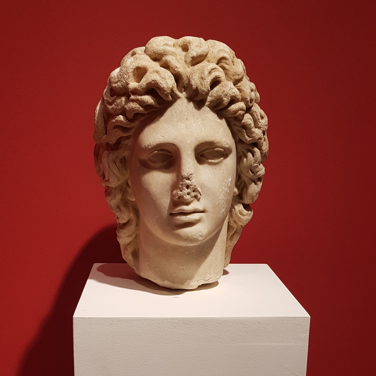 아래의 석상은 청년 시절 알렉산드로스 대왕 조각상으로, 비록 수 천년 세월에 부서지고 긁혔지만 비범하고 예리한 표정만은 생생하게 살아있다. 그는 서양사상 처음으로 살아 있는 동안 개인 숭배의 대상이 되었으며, 로마가 그리스를 정복한 이후에도 영웅으로 추앙받았다. 전시회 마지막 벽면 폼페이에서 발견된 알렉산드로스 대왕 모자이크 작품을 통해 사후에도 영향력을 유지했던 그의 기상을 확인할 수 있다.