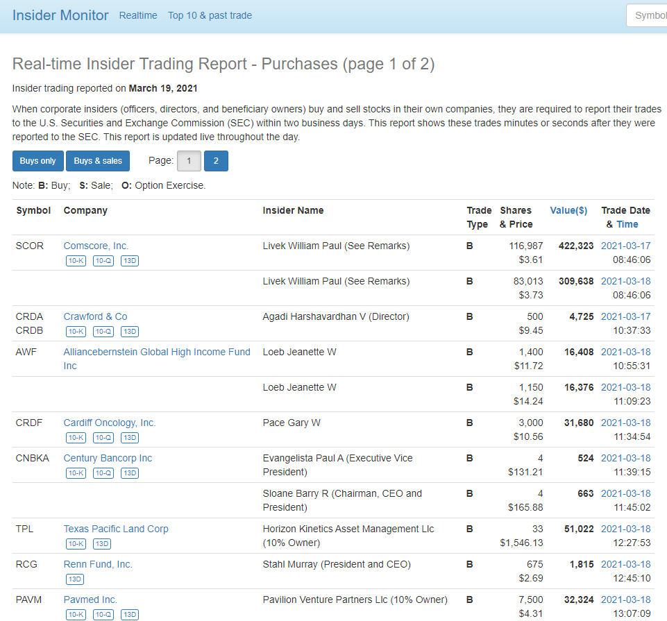 그래서 Secform4와 연동해서 보는 웹사이트가 실시간으로 무료 업데이트되는 Insider-monitor이다. 다양한 카테고리의 항목이 있는데 집단으로 매수한 기업 리스트, 실시간으로 업데이트되는 기업 등등 다양한 메뉴가 있다.