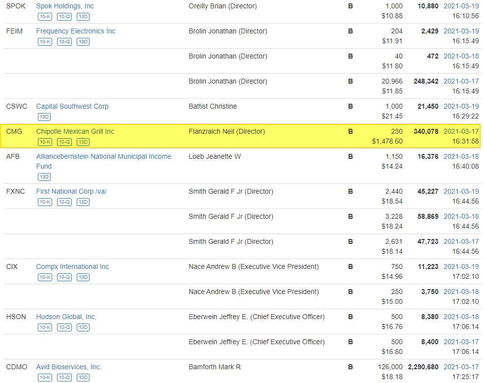 치폴레의 티커 CMG를 위에서 소개했던 secform4에 검색해보면 Neil이라는 내부자가 3월 17일에 치폴레의 주식을 230주 매수를 한 것이 보일 것이다. 최근 2월부터 3월 사이에 모든 내부자들이 주식을 대량으로 매도했는데 어느 날 갑자기 FLANZRAICH NEIL이 혼자 꿋꿋한 게 매수를 했다면, 필자는 이러한 현상을 좋은 신호로 본다.