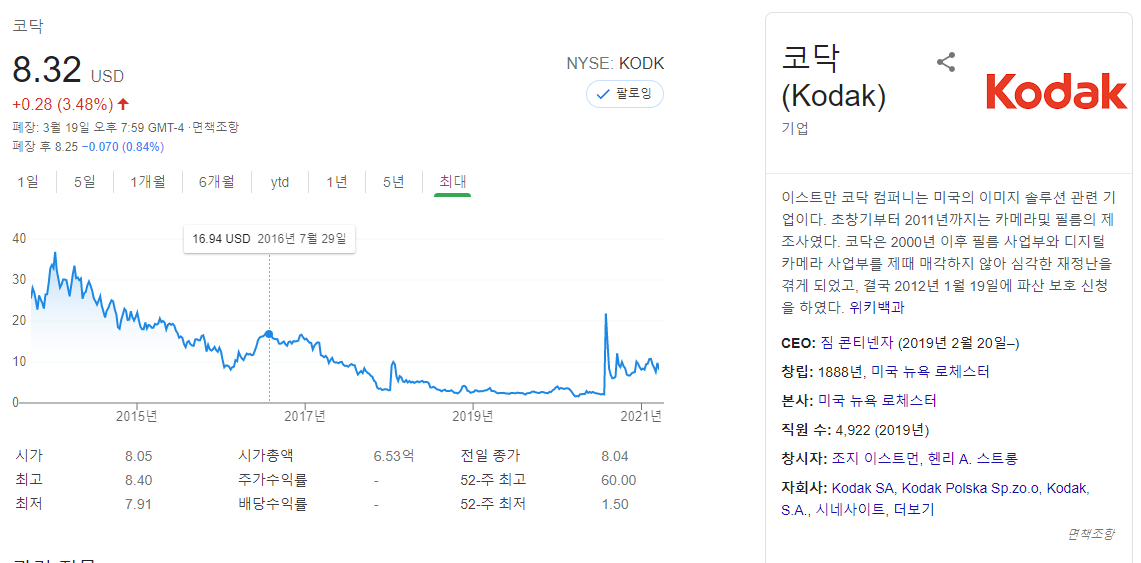 대신에 코닥처럼 바닥까지 간 기업들은 긍정적으로 봐도 재무적인 리스크가 있을 수 있으니 항상 긴장의 끈을 놓치지 말고 확인하는 습관을 가져야 한다. 절대로 내부자가 샀다고 해서 따라 사는 뇌동매매는 하지 않기를 바란다.