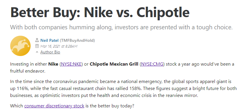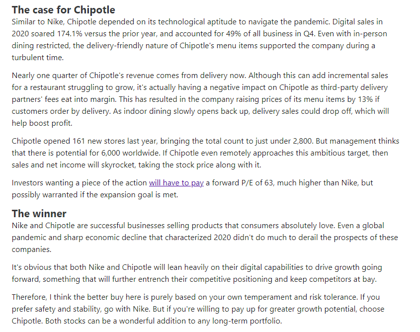 기승전결이 잘 되어있고, 독자분들이 쉽게 이해할 수 있게 글을 써내는 Motley Fool의 사이트도 참조해본다. 위 사진은 나이키(NKE)와 치폴레(CMG) 중 어떠한 주식을 매수하는 것이 좋을지 평가하는 글이다. 치폴레도 더 크게 성장할 가능성이 있다고 추천해준 것이 보인다.
