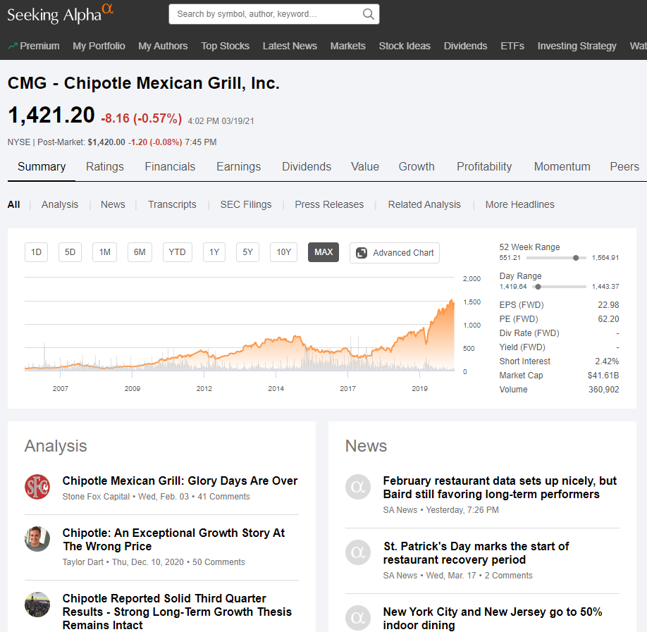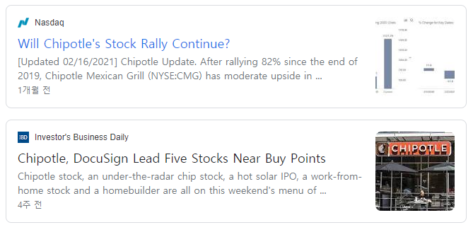 다음으로 구글 뉴스에 CMG stock 혹은 Chipotle stock이라고 검색해보거나, Seeking Alpha에 가서 어떤 평가를 내리는지 확인해본다.