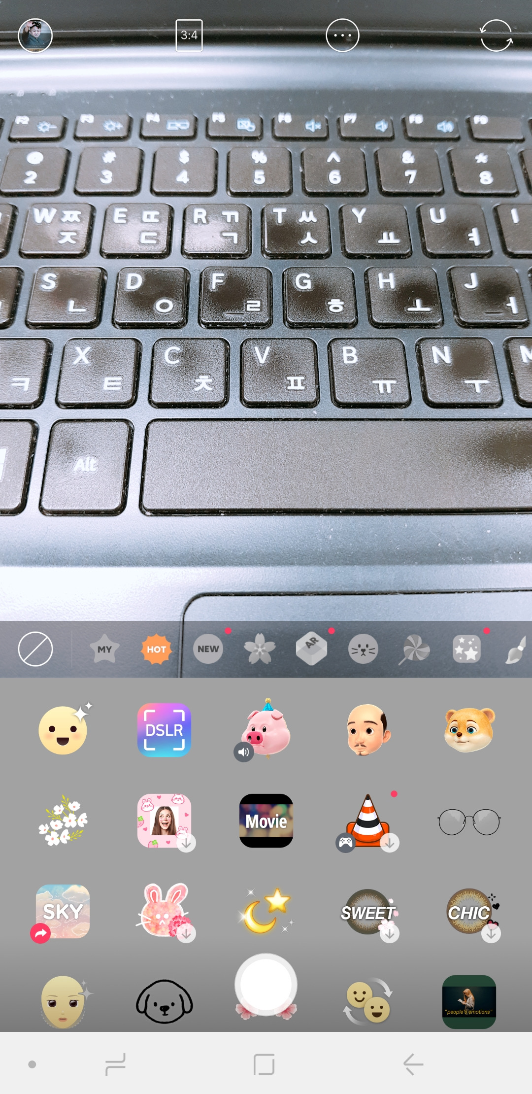 스노우 앱을 켜면 나오는 첫 화면입니다. 새로운 효과는 NEW에서, 사람들이 많이 쓰는 효과는 HOT에서 확인할 수 있어요. 아직 다운받아보지 않았는데 컬러렌즈를 착용한 것처럼 만들어주는 효과도 있군요. 얼른 다운받아봐야겠어요.