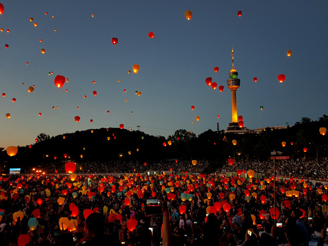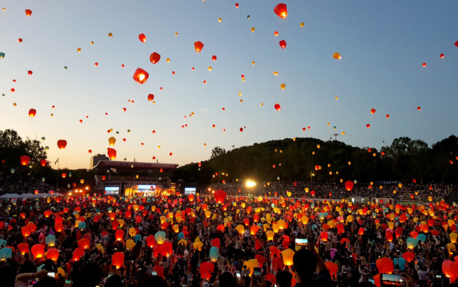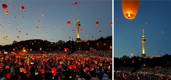하지만 이제 아는 사람들은 안다. 그렇게 멀리 가지 않고도 아름다운 풍경을 감상할 수 있다는 걸. 매년 봄, 대구에서 대규모 풍등 날리기 행사를 열기 때문이다. (사)대구불교총연합회에서 주최하고 형형색색 달구벌관등놀이축제준비위원회가 주관하는 ‘형형색색 달구벌 관등놀이’. 매년 부처님 오신 날 즈음해 열리는 이 행사는 일명 ‘라푼젤 실사판’이라고 불리며 많은 이에게 사랑받는 지역 축제로 자리매김했다. 해외에서도 소문을 듣고 찾아올 정도다. 예매 전쟁이 워낙 치열하다 보니 암표가 10배 이상 높은 가격에 팔릴 정도로 표 구하기가 어렵지만 말이다.
