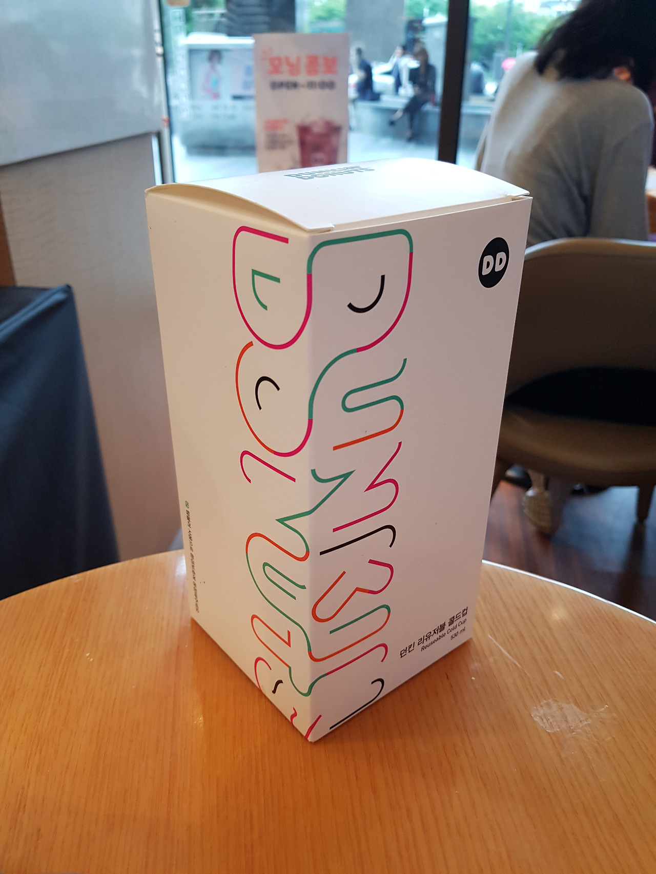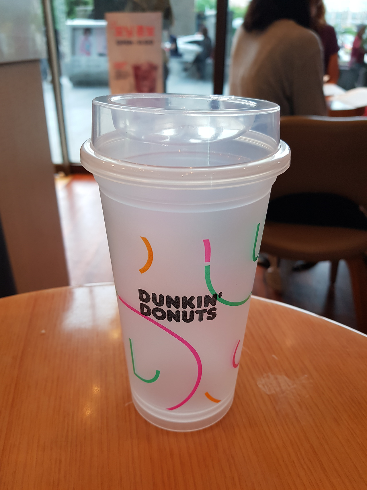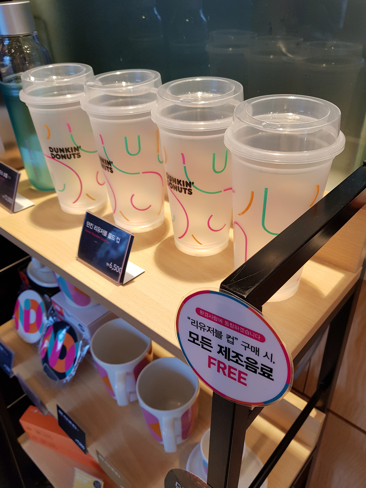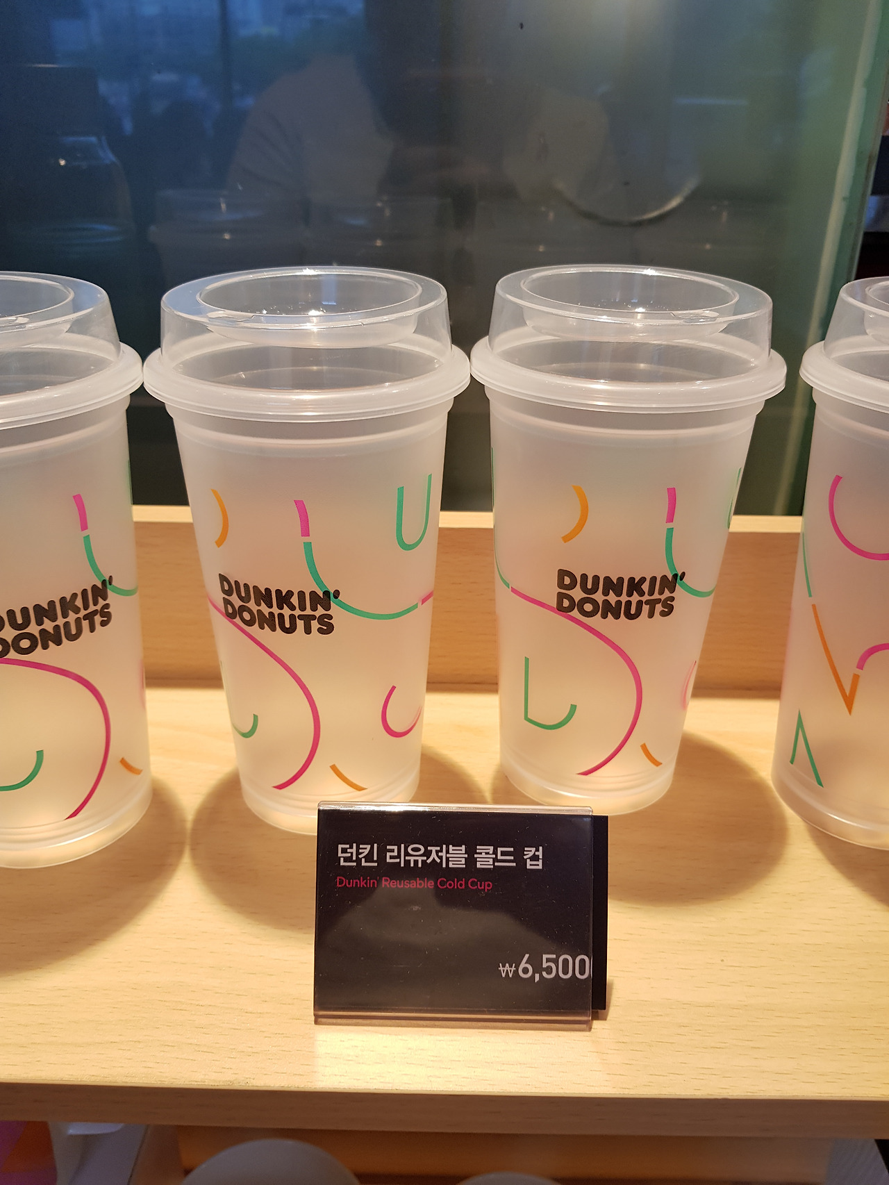 그리고 우리는 순간이동으로 던킨도너츠에 도착했습니다. (갑자기?) 일회용품 줄이기의 일환으로 여러 프랜차이즈 카페에서도 대책을 내놓고 있는데요. 던킨도너츠에서는 6500원짜리 리유저블 컵을 구매하면 모든 제조음료를 무료로 제공하는 이벤트를 하고 있어요.