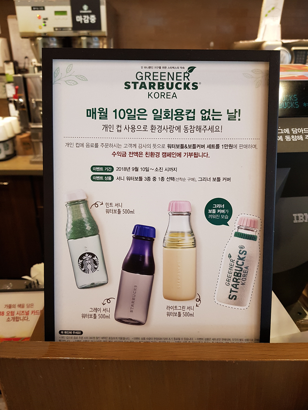 아무튼 그렇게 종종 가는 저의 카페 오피스, 코피스, 스타벅스에 가니 얼마 전부터 개인 텀블러를 가져와 음료를 주문하면 워터보틀과 커버를 합쳐서 1만 원에 판매하는 이벤트 중이더라고요.