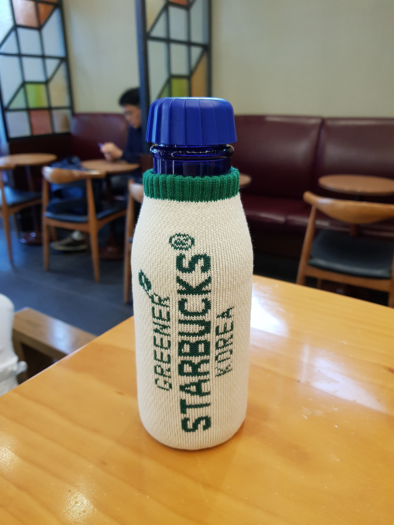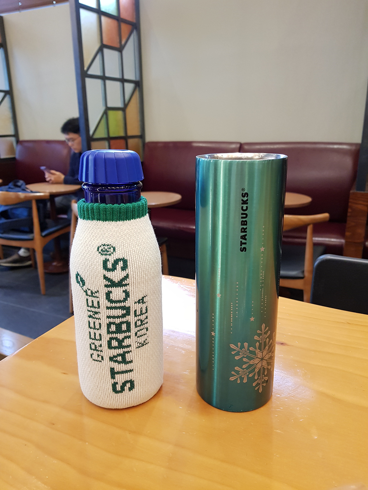 우측은 저의 오랜 커피 동료이자 후배가 생일 때 선물해준 스타벅스 텀블러. 이거 들고 갔다가 이벤트를 지나치지 못하고 텀블러 요정의 길을 걷기로 한 제가 구입한 워터보틀이 왼쪽이에요. 워터보틀 정가는 1만7000원이라 마침 필요했던 분들에겐 7000원 싸게 살 기회예요. 거기에 마치 스타벅스 양말 같은 커버도 주잖아요?