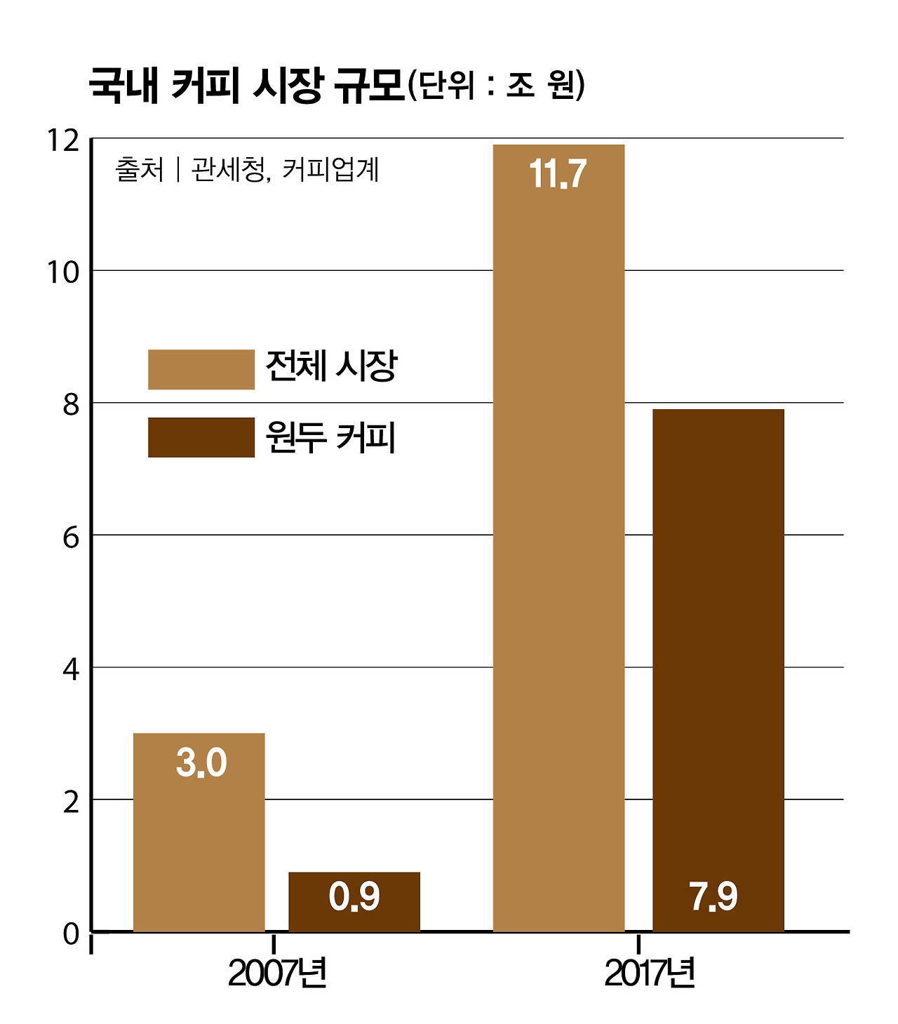 커피시장은 소비자의 취향 세분화, 프리미엄 원료 사용 증가 등으로 그 규모가 지속적으로 커지고 있다. 과거 커피시장은 커피 대중화 1세대라고 볼 수 있는 ‘커피믹스’나 ‘캔커피’ 등 인스턴트커피 위주였으나 1998년 할리스커피가 국내 최초로 에스프레소 커피전문점을 오픈한 후 시장이 급성장했다. 2007년 9000억 원대이던 국내 원두커피시장은 지난해 7조8528억 원으로 8배 이상 커졌다.