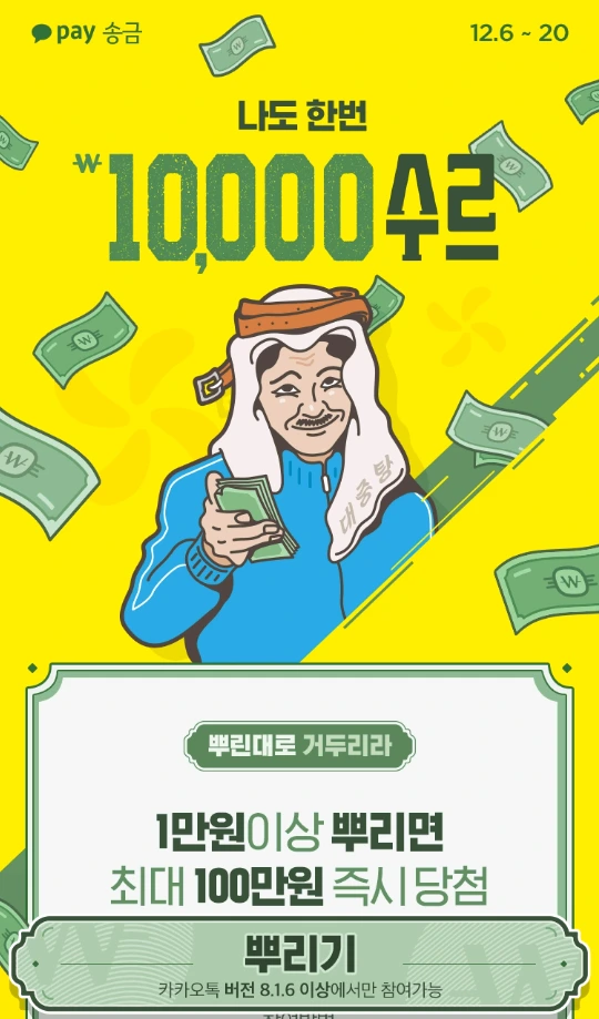 카카오페이 카카오톡 내 송금 메뉴에서 쓸 수 있는 뿌리기 기능으로 만수르 가 되어봤습니다. 카카오톡 가장 최신 버전으로 업데이트해야 뿌리기 기능을 즐길 수 있어요.