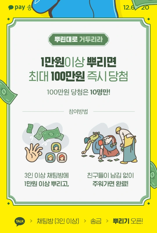 그런데 확실히 악용될 위험도 있어보이긴 하네요. 저는 5000원 세 번으로 세 개의 단톡방에 재미 를 준 것으로 만족합니다. 돈을 뿌려본 건 태어나서 처음이네요!