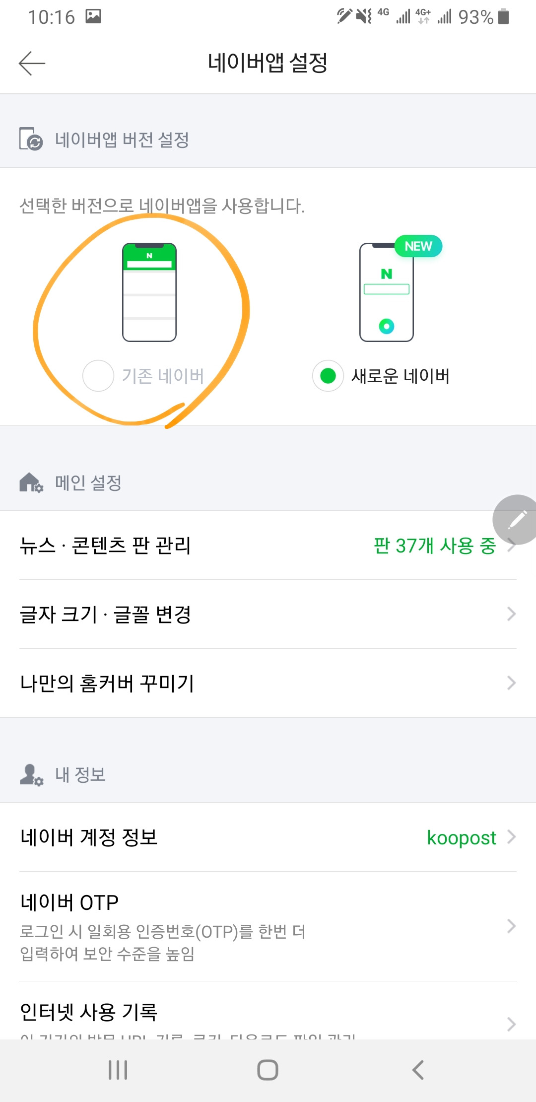 바로 이런 화면이 뜹니다. 기존 네이버를 선택하고 확인을 누르면 개편 전의 메인화면을 앱에서 활용할 수 있습니다.