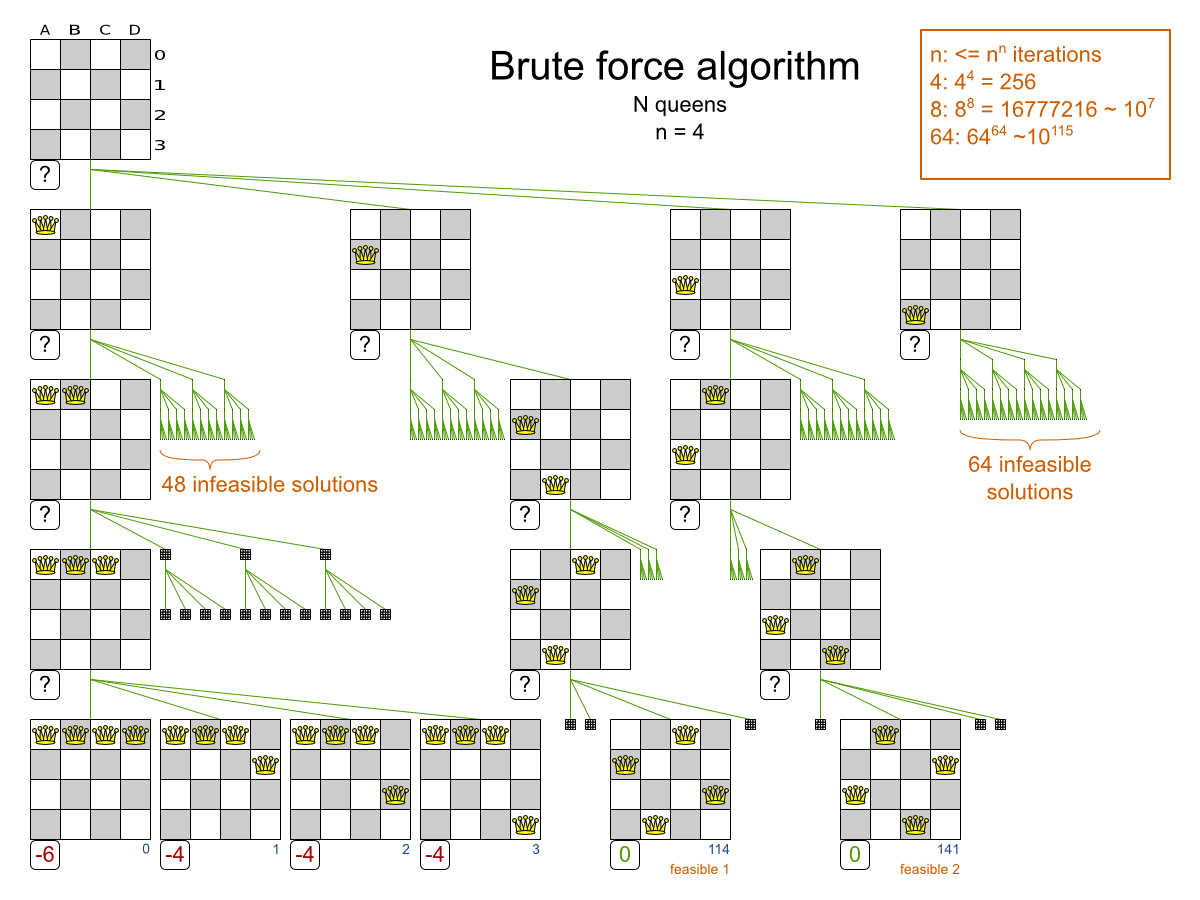 부트캠프에서 배웠던 탐색 알고리즘 중, '완전 탐색' (Brute force algorithm)이 있었다. 아래 그림을 보면, 4x4 (n=4) 체스판에 여왕(queen)을 놓을 수 있는 경우의 수를 구하는 것이다. 컴퓨터가 문제를 푸는 방법은, 하나씩 놓아보고 판단하는 것이다. 생각보다 컴퓨터는 엄청 멍청해서 모든 계산을 다 해보고 결정한다. 대신 엄청 빠르게 실행을 하기 때문에 우린 눈에는 이런 뒤에서의 삽질이 보이지 않는 것이다. (요즘 하는 빅데이터, 머신러닝 이런 건 전 잘 몰라요) 듣기로 알파고의 동작 원리도, 그 순간에서 둘 수 있는 모든 수를 다 둬보고 승률을 모두 계산하여, 최선의 승률 쪽으로 선택한다고 한다(틀릴 수도 있습니다).