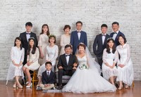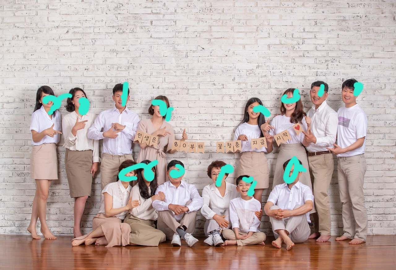 대망의 팔순 생일 잔칫날, 우리는 일단, 제주의 모 사진관으로 모여 가족 전체 사진을 찍었다. '리마인드 웨딩'느낌으로 턱시도와 드레스를 입는 컨셉과 케쥬얼복을 통일해서 입는 컨셉으로 진행했다. 단순히 기념 촬영하자는 목적이었는데, 의외로 분위기가 너무 고조되었다. 미용실에 들러 '신부화장'까지 한 친정어머니는 고우셨고, 여전히 슬림하고 꼿꼿하게 관리를 잘하신 아버지도 턱시도가 괘 잘 어울리는 바람에 근사한 '사진'들이 마구 배출되었다. '주책'이라고 드레스랑 턱시도 안 입는다 하셨던 부모님은 어디 가신 건지, 능숙하게 '입맞춤'포즈까지 하시는 두 분 ㅎ ㅎㅎ... 나머지 가족들도 모처럼 입어보는 근사한 차림에 꽤 흥분하며, 행사를 즐겼고 얼굴에 는 웃음이 넘쳐났다.