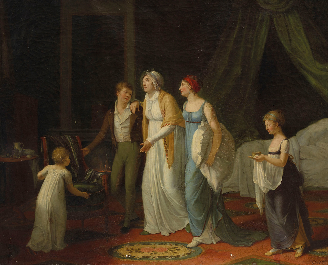 하얀 잠옷에 숄과 나이트캡을 두른 한 여인이, 배경 오른편의 침상에서 조심스레 몸을 일으켜 서 있다. 아직 보행이 힘겨운 듯한 그녀 곁에는 두 자녀가 다가와 부축하고 있다. 젊은 딸은 의자에 놓을 베개를 들고 있으며, 어린 남동생은 어머니를 위해 의자를 끌어오려 한다. 화면 왼편에서는 막내아이가 등 돌린 채 가족을 향해 걸음을 옮기고, 오른편에서는 또 다른 딸이 따뜻한 음료가 담긴 잔을 고요한 표정으로 가져오고 있다. 출처 Fichier:Constance Charpentier - A Mother Recovering with the Help of her Children.jpg — Wikipédia