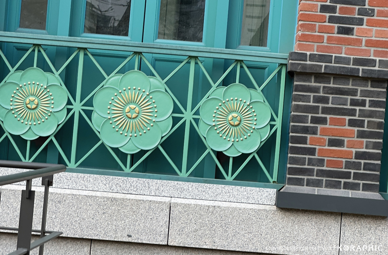처음에 돈덕전이 다시 지어진다는 이야기를 들었을 때 궁궐 내의 건축이 늘어난다는 인식 자체가 낯설어 중명전처럼 권역 외의 곳에 있는 줄 알았다. 돈덕전이 덕수궁 어디에 있을까, 그 안에 뭐가 더 생길 수 있을까 궁금해하며 일부러 사전지식 없이 덕수궁을 찾아가 보았다. 아기자기한 궁내를 거닐다 보니 ‘이제 진짜 덕수궁 끝인데’라는 생각이 들 때쯤 국립현대미술관 덕수궁관과 석조전 사이에 새로운 건물이 눈에 띄었다. 멀리서 보이는 돈덕전은 석조전의 본격적인 서양식 외관과는 또 다른 느낌. 한국과 서양의 건축양식이 절충된 정관헌보다는 본격적인 건물이라는 느낌이 들었고 일단 틸 계열의 겹오얏꽃 문양이 먼저 보인다. 솔직한 첫 인상은 ‘오얏꽃 문양이 있다’ 보다 ‘청록색 겹오얏꽃이 쾅쾅 박혀있다’라는 표현이 더 적당하게 느껴질 정도로 아담한 2층 규모의 건물에 비해 크게 여러 개 위치한 겹오얏꽃 문양이 눈에 들어왔다.