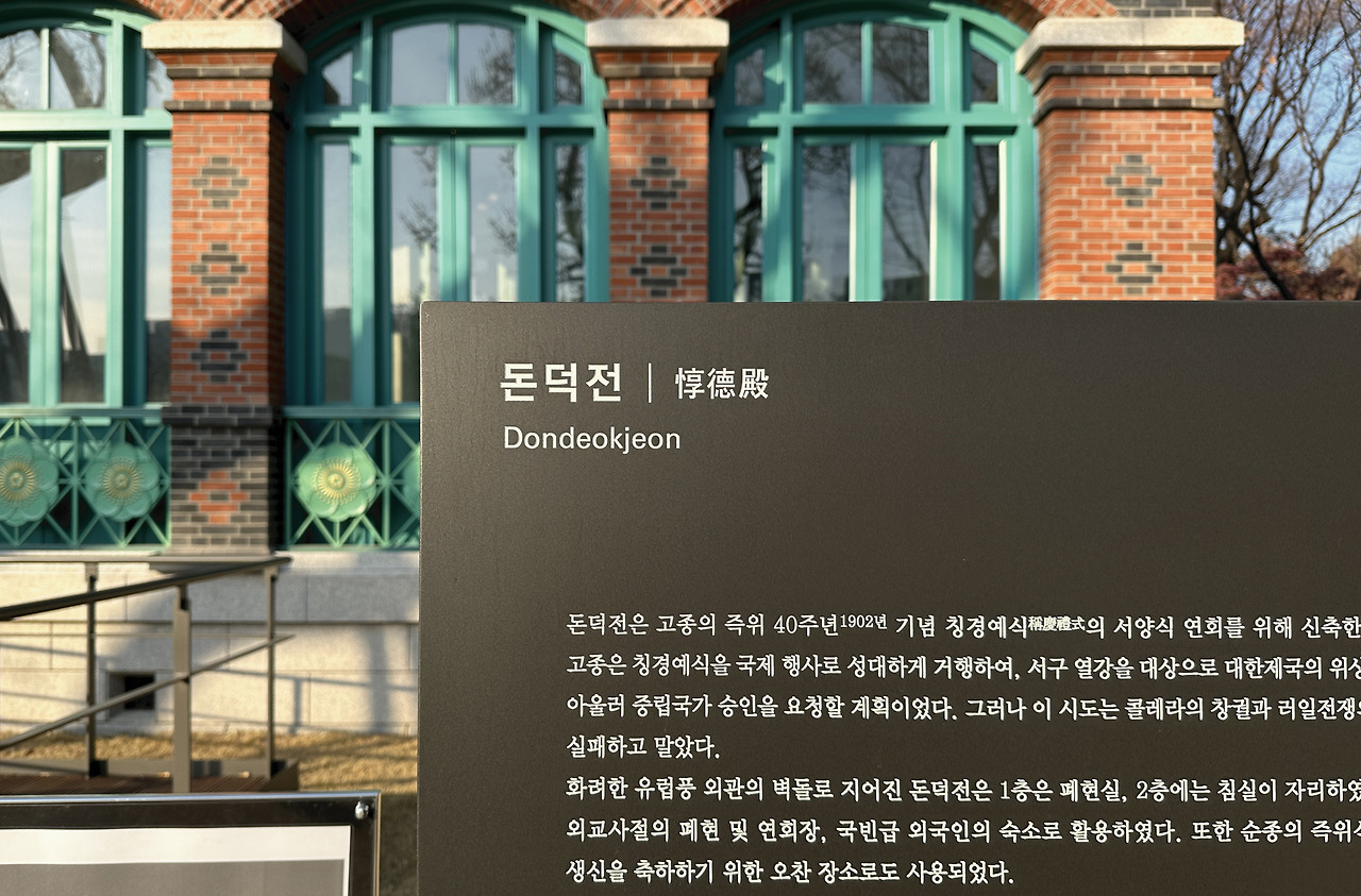 ‘돈덕(惇德)’이라는 명칭이 낯설어 찾아보니 ‘덕 있는 이를 도탑게 해 어진 이를 믿는다’ 라는 의미라고 한다. 쉽게 머리에 들어오는 표현은 아닌데 ‘덕이 있는 자’는 교류하며 신뢰를 쌓아가야 할 여러 국가를 가리킨다고 한다. 과거 황제가 외국 공사를 만나는 연회장이나 외국 귀빈이 묵는 영빈관으로 사용한 곳이기에 붙여진 이름 같다. 당시에는 명칭의 의미를 어떻게 외국어로 번역했을까 궁금해졌는데 돈덕전 앞 안내판과 궁내 리플렛 등에는 모두 Dondeokjeon 으로 표기되어 돈덕전의 의미까지 외국어로 풀어 안내되었을지는 아쉽게 알기 어려웠다.