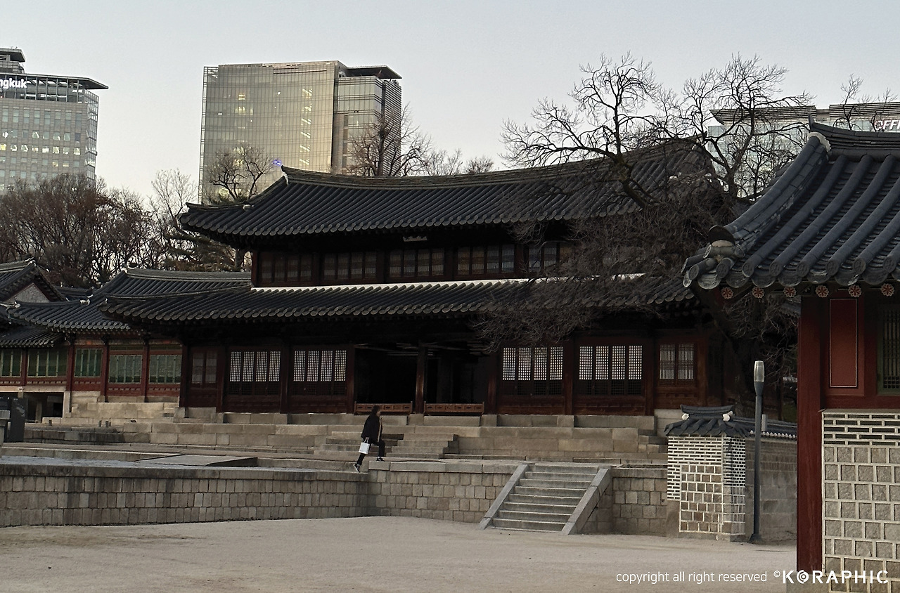 두 번째로 덕수궁은 유난히 도심 한가운데에 있는 느낌이다. 많은 궁궐이 현대적인 건물과 도로들 사이에 위치할 수밖에 없지만 다른 궁궐들은 정문을 지나 안으로 들어오면 어느새 시간여행을 하는 느낌을 받을 정도로 외부와 분리되었다는 안정감을 느낀다. 요즘 유행하는 사극 로맨스코미디물의 한 장면 속에 들어온 것 같은 망상에 빠질 때도 있다. 코너를 돌면 한복 입은 김유정 배우가 나타날 것 같은. 그런데 덕수궁은 그리 크지 않은 규모 때문인지 서울 생활을 함께하는 느낌이 든다. ‘여기서부터 궁궐입니다’라는 명징한 구분을 하는 경복궁보다는, 경주에서 길을 걷다 갑자기 나타나는 왕릉이나 탑들처럼 도시와 일상에 녹아 들어있는 느낌을 준다. 실제로 개방시간도 밤 9시까지로 넉넉하다.(다른 궁궐들은 6시 안짝으로 닫는다. 입장 마감은 한 시간 전)