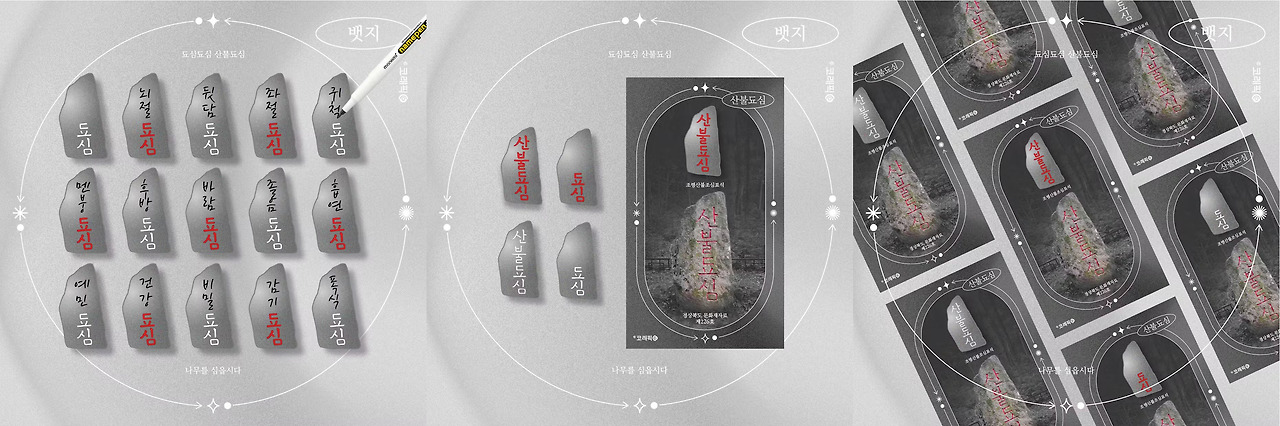 뱃지, 키링의 배경지를 리디자인하고, 마스팅테이프, 박스테이프를 추가해 총 네 가지 아이템을 출품하는 것으로 정리했다. 한 프로젝트에서 네 가지 아이템이나 만들게 되니 이번에는 기획 의도 자체를 단순하게 정리할 필요성을 느꼈다. 감히 디자인으로 얄팍하게 뭘 가르친다거나, 이 비석의 요소들을 활용해서 재미있는 무언가를 만들어보는 데에까지 가지 않고, 내가 느낀 이 문화재의 매력을 다른 분들도 느껴보았으면 해서 내가 흥미를 가지고 찾아봤던 비석의 매력 포인트들을 디자인으로 잘 나열해서 전달하면 되겠다 싶었다. 그래서 2년 전과는 다르게 기획 의도를 ‘이 비석을 잘 정리해서 알리자’라고 정하자 그다음부터는 디자인이 술술 풀렸던 것 같다.