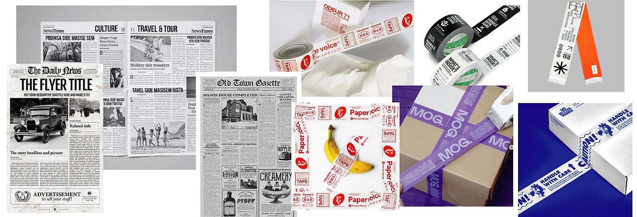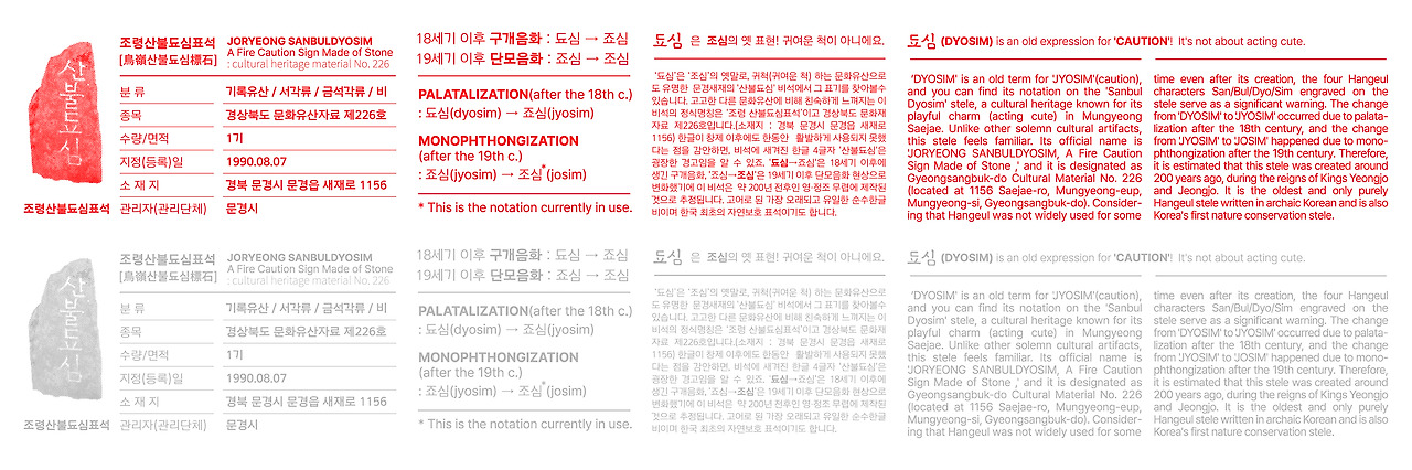 펀딩을 위한 기획으로 디자인할 때에는 다양한 방향이 상충했기에, 이도 저도 아니게 흘러갔던 것 같다. 말 그대로 콘셉트가 너무 많아 콘셉트가 없는 프로젝트였었다. 이번에는 ‘산불됴심 비석을 알리자’라는 일관된 콘셉트가 있어서 비석을 설명하는 이미지와 표, 그리고 문단을 배치하는 디자인으로 정리가 되었고 자연스럽게 신문지나 잡지의 레이아웃이 레퍼런스가 되었다. 주로 옛 신문지를 연상하며 작업했기에 한 가지 컬러로만 디자인하고, 비석을 망점 이미지로 변환했다. 비석에서 가장 놀랐던 부분인 ‘됴심’의 변화과정인 구개음화와 단모음화에 따른 변화를 정리하는 문단, 비석에 대한 기본적인 명제표, 이에 대한 한글과 영어로 설명하는 문단을 만들어 배치하면서 디자인을 전개했다. 그리고 비교적 단순한 뱃지와 키링의 배경지 디자인에 비해 가로로 길면서도 반복되는 테이프의 특성상 됴심(=주의)을 상징하는 다양한 주의 아이콘(caution sign icons)들을 활용하였다. 아무래도 박스테이프는 말 그대로 박스 포장에 사용될 것이기에 산불됴심의 메시지를 그대로 가져오는 것은 어색하겠다 싶어 다양한 아이콘들을 배치하는 방식으로 약간의 꾸밈을 더했다.