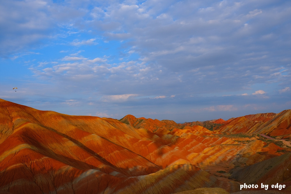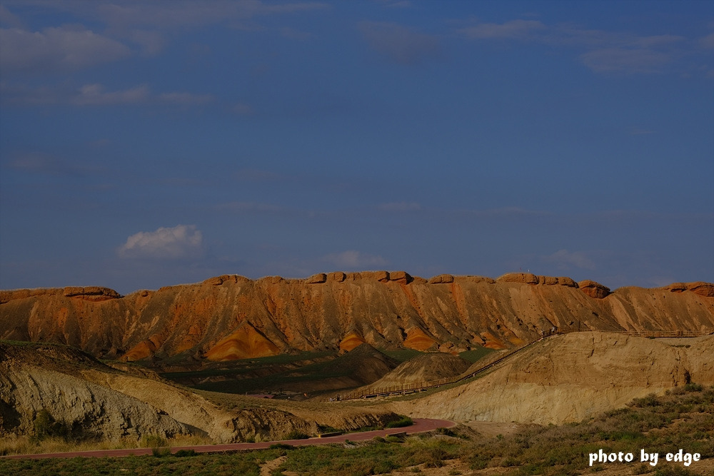 단하지모(丹霞地貌)에서 '단하(丹霞)'는 햇빛에 비치는 붉은빛의 기운 즉 붉은 노을을 의미하고 '지모(地貌)'는 지형을 의미한다. 칠채산은 오랜 시간 지질운동을 거친 붉은색 사암이 풍화와 퇴적, 침식 작용을 거쳐서 빨강, 노랑, 초록, 흰색 등의 퇴적물들이 층층이 쌓이면서 지금의 모습이 되었다. 특히 흰색은 소금결정으로 아주 먼 고대에는 이곳은 바다였다가 융기하였다는 추측도 한다. 암튼 이걸 수채화라고 표현해야 할지 파스텔화라고 말해야 할지는 모르겠지만 강한 색감의 느낌이 묘한 분위기를 만들고 여기에 일출과 일몰의 태양으로부터의 붉은빛까지 더해지면 그 장엄한 느낌은 말로 표현하기가 힘들고 여기저기 셔터를 눌러대더라도 단순히 사진 한 장으로 표현하기는 쉽지 않다. 거기에 더해 전날 내린 비 혹은 습기를 머금은 상태라는 조건까지 충족하면 카메라에 일부러 필터를 쓰지 않더라도 색상 대비 강한 자연의 수채화가 대평원에 그려지게 된다.