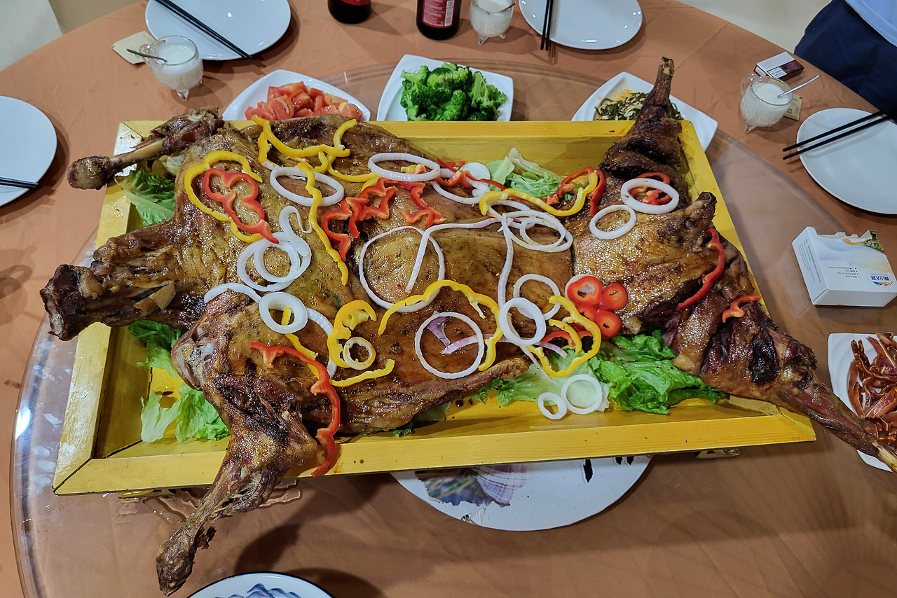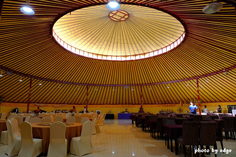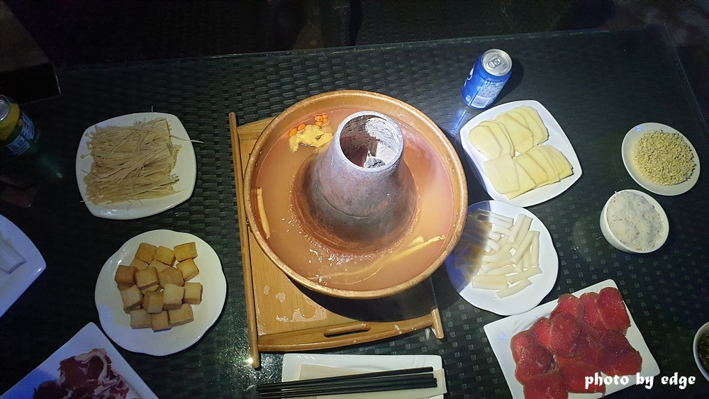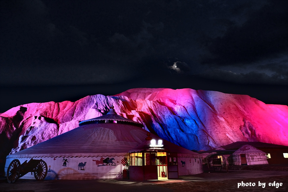 저녁은 게르 안에서 컵라면이나 먹을까 하다가 대형게르 옆으로 단하지모 지형이 보이는데 여기에 여러 가지 색채의 조명을 쏘고 있고 은은한 중국적인 음악이 나오는데 이게 또 다른 몽환적인 분위기를 만들어내고 있어서 도저히 그냥 게르 안으로 들어갈 수는 없었다. 메뉴를 보니 구이도 있고 샤부샤부도 있는데 우리의 선택은 샤부샤부. 참고로 양고기 한 마리를 주문할 수도 있는데 그건 미리 예약을 해야 한다. 비슷한 시기에 시닝에서 바로 이곳을 방문한 친구들은 새끼 양고기 통 바비큐를 2000 RMB(한화로 약 36만원), 실제로는 2400 RMB정도에 통바비큐와 그 외 요리 6가지, 야크 요구르트, 고량주 1병 이렇게 먹었는데 장정 6명이 한참을 먹고도 남았으니 혹시 여러 명이 방문한다면 특별한 추억 한번 만들어도 재미있겠다.