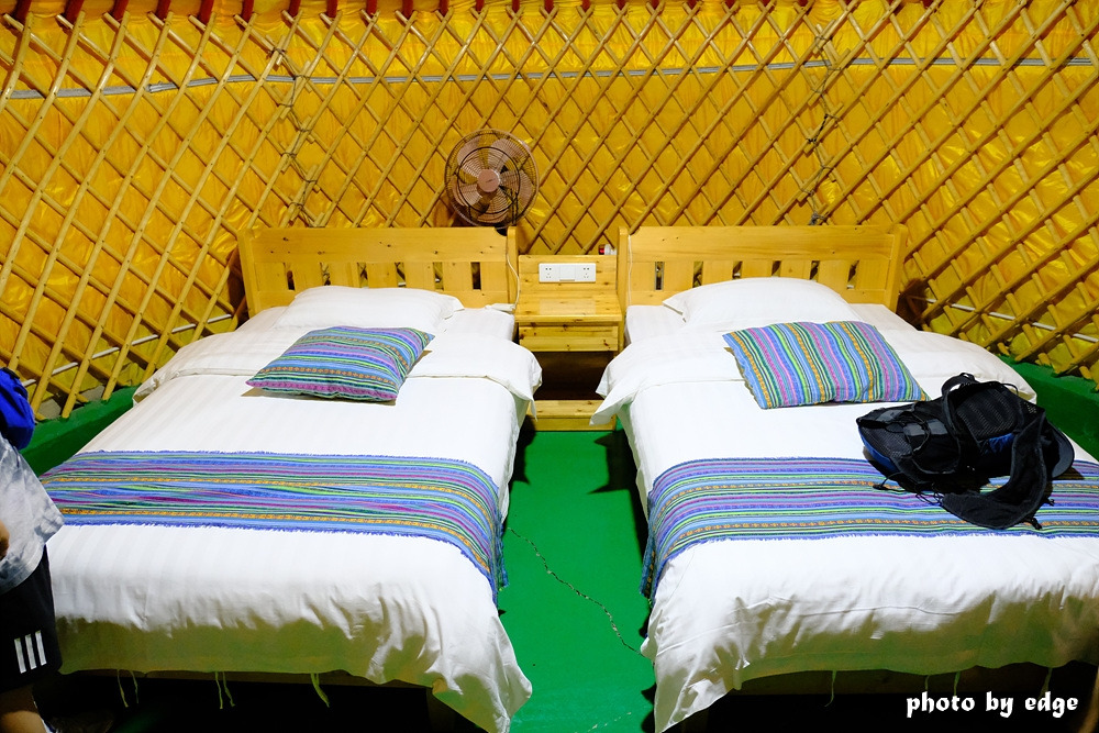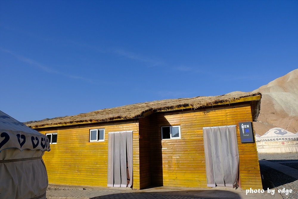 사실 게르는 생각만치 낭만적 이기만 하지는 않다. 실제 현지인의 게르를 들어가 본 적이 있는데 만약 사진을 찍었다면 뭔가 고풍스러움도 있고 인간미 넘치는 유목민족의 기분을 흠뻑 느낄 수 있었겠지만, 그것 보다도 냄새라던지 청결 상태가 (사실 무던한 편인 나로 써도) 좋은 편이 아니라 왠지 몸이 근질거리는 느낌을 받은 적이 있다. 그리고 중국에서 관광객을 위한 게르나 글램핑의 경우도 화장실이나 편의 시설이 한국의 그것과는 차이가 많이 나는 경우가 대부분이다. 청소 상태뿐만 아니라 기본적으로 머랄까 사용하는 사람이나 시설을 제공하는 사람이나 씻는 것에 대해 크게 신경을 안 쓴다거나 혹은 쓰레기에 대해서 자유스럽다고 해야 하나 음식물쓰레기나 포장용기의 분리수거라는 개념이 아직은 철저한 편은 아니다. 그래서 쓰레기통이 넘쳐흐른다거나 아무 곳에나 음식물이 보인다거나 하는데, 이곳은 조금은 허술하기는 해도 샤워시설도 깨끗하게 유지되고 따뜻한 물도 잘 나오고 있었고, 게르 근처 간단한 세면대도 설치되어 있고 무엇보다 자는 곳이 비교적 깨끗하게 청소가 되어 있다. 칠채산과 가까워서 예약을 했는데 운이 좋았다고 밖에. 덕분에 멋진 풍경을 배경으로 야외에서의 캠핑 기분으로 편안한 시간을 보낼 수 있었다.