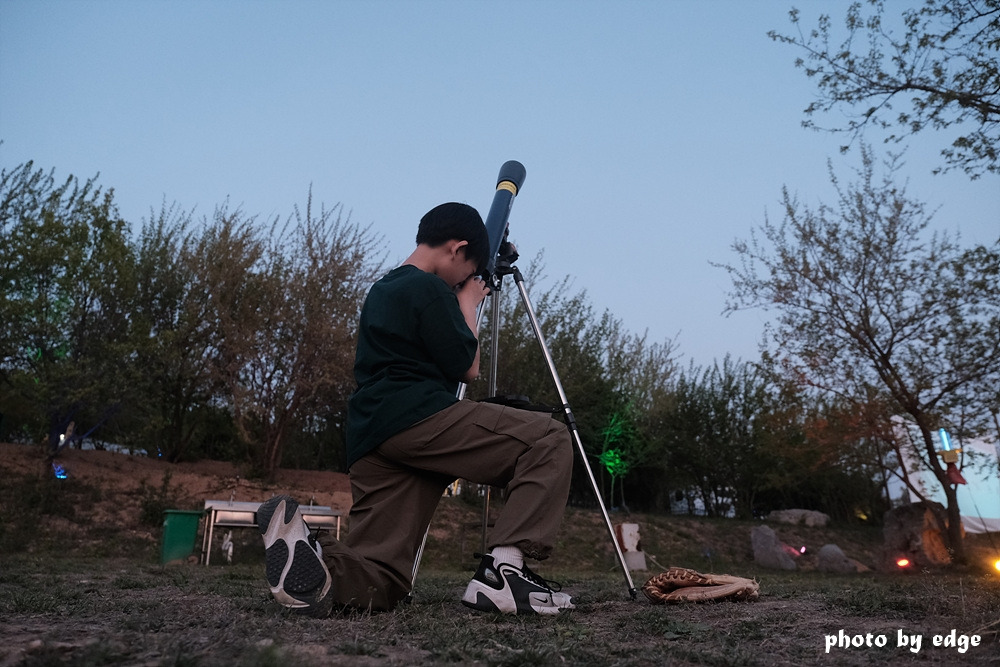 낭야대 별빛캠핑장 Langyatai Starry Camp 이라는 이름이 붙게된 제일 큰 이유중에 하나가 별빛을 볼수 있는 점인데, 밤 조명이 강한편이어서 밤에는 잘 안보이고 오히려 늦저녁 밤에 캠핑장에서 제공해주는 천체망원경 (좋은건 아니라서 안정된 관측까지는 힘들고) 으로 보는 달이 아이들한테는 매력적인 점이 아닌가 한다.