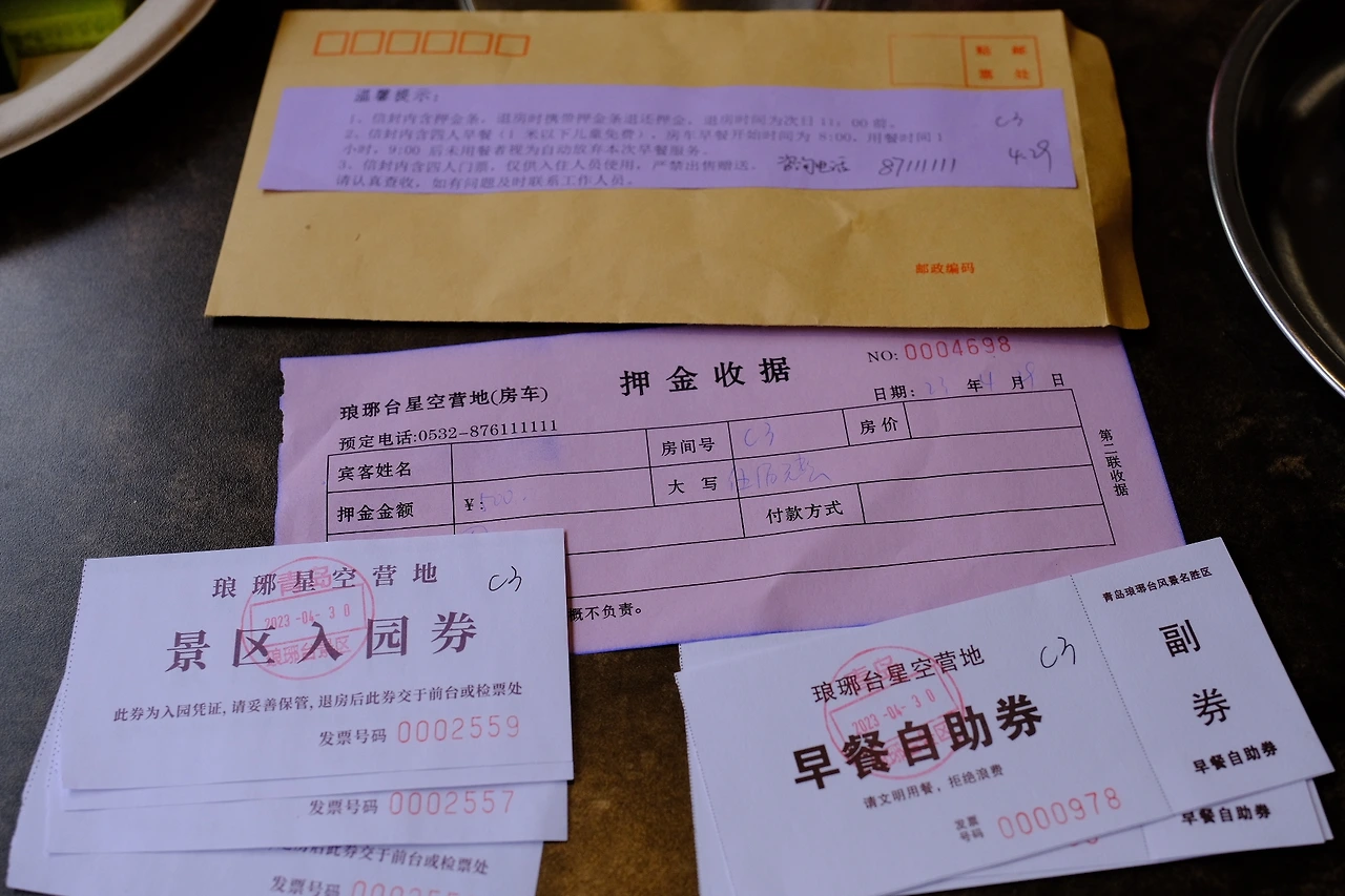 침구는 매일 교체가 가능하고 제공되는 식사 및 랑야대 입장권이 포함된 금액은 1099 RMB, 대형은 1299 RMB이다.(캠핑카 1대당 500 RMB 보증금은 나중에 퇴실할 때 랑야대관광지 매표소에서 받을 수 있다.) 아침식사도 포함되어 있는데 이곳 야영지가 아니고 랑야대관광지 매표소 건물에서 중국 뷔페 식으로 만두나 간단한 반찬류, 우유 정도를 먹을 수 있으니 참조하면 좋겠다. (조식 시간은 8시 ~ 9시이나 미리 이야기해 두면 어느 정도는 조정이 가능해 보였다.)