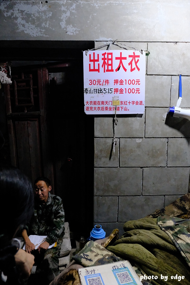 어둠에 돌계단을 돌계단 한번 앞사람 머리 한번 보면서 걷다 보니 슬슬 정상이 다가오는데 용문을 지나고 나니, 본격적으로 우모복을 대여해 주는 상점이 나오는데 오늘의 태산 일출은 05:15 예정.