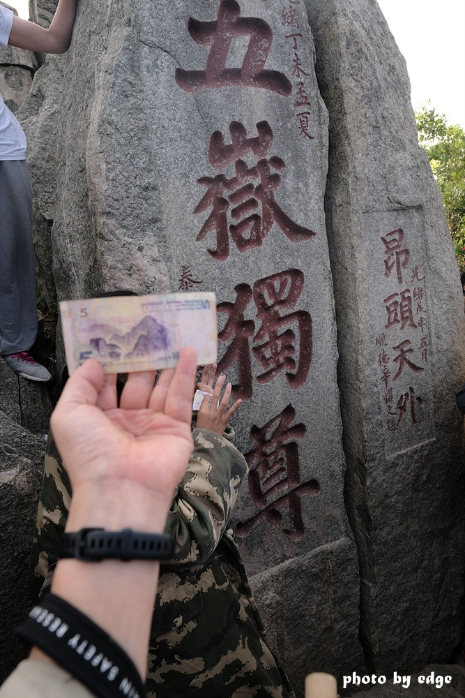그래도 중요한 오악독존 비석 앞에서 사진 프레임 안에 어떻게든 사람이 나오지 않게 5위안 지폐와 함께 찍어서 다행이다.