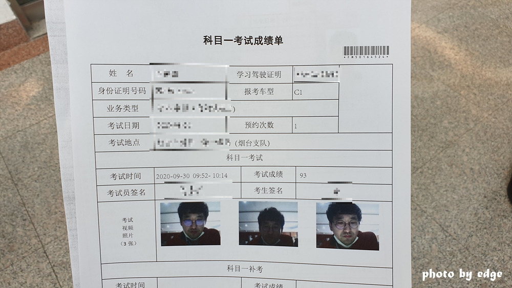 서류 한 장 받아 보니 기본적인 정보와 함께 커닝을 방지하기 위함인지 아니면 본인이 맞는지를 확인하려는 목적인지는 몰라도 시험을 보는 모습도 사진으로 출력이 되고 성적과 면허증에 기입이 되는 내용이 포함되어 있다.