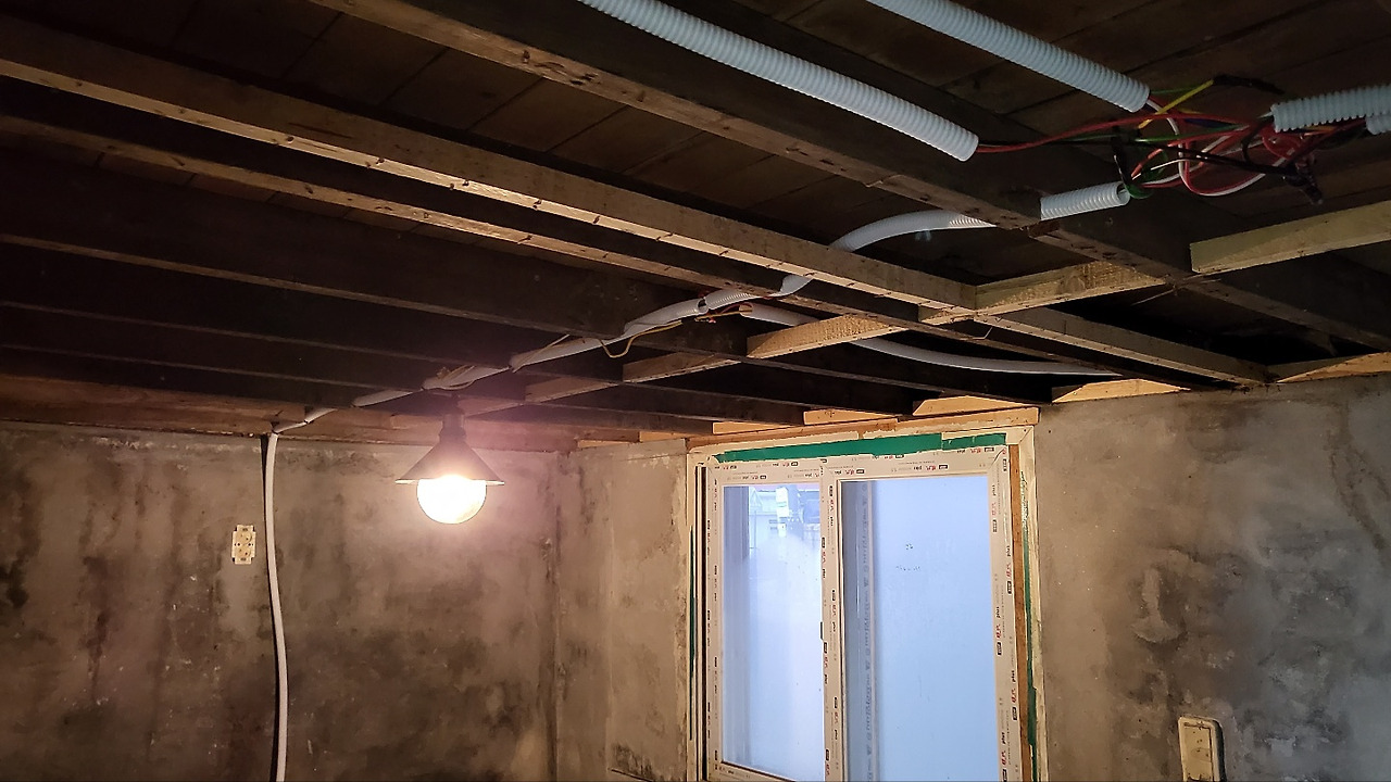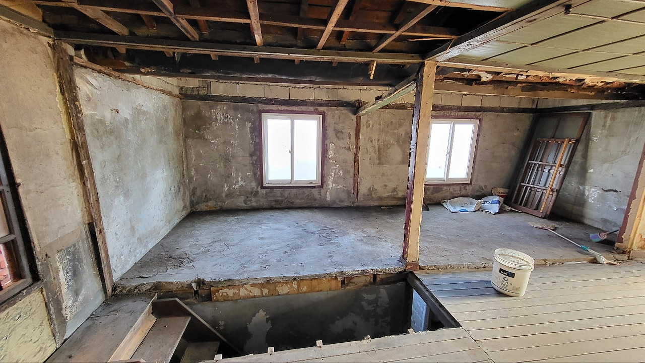 1층 천장이면서 2층의 바닥인 면은 나무마루 형식이라 뼈대로 보강하고, 오래된 전기라인들도 싹 다 교체하였다. 하면 할수록 손댈 곳이 하나둘 생기게 된다. 눈에 보이지 않는 부분이 열리면서 하나하나 손보지 않으면 문제 되는 부분이 발생하므로 하는 길에 이것도 저것도 하다 보면 예상했던 견적보다는 항상 더나 올 때가 많다. 이러한 부분 때문에라도 계약 단계에서부터 견적 뽑을 때도 꼼꼼하게 구체적으로 범위를 잘 계약해서 진행해야 한다.