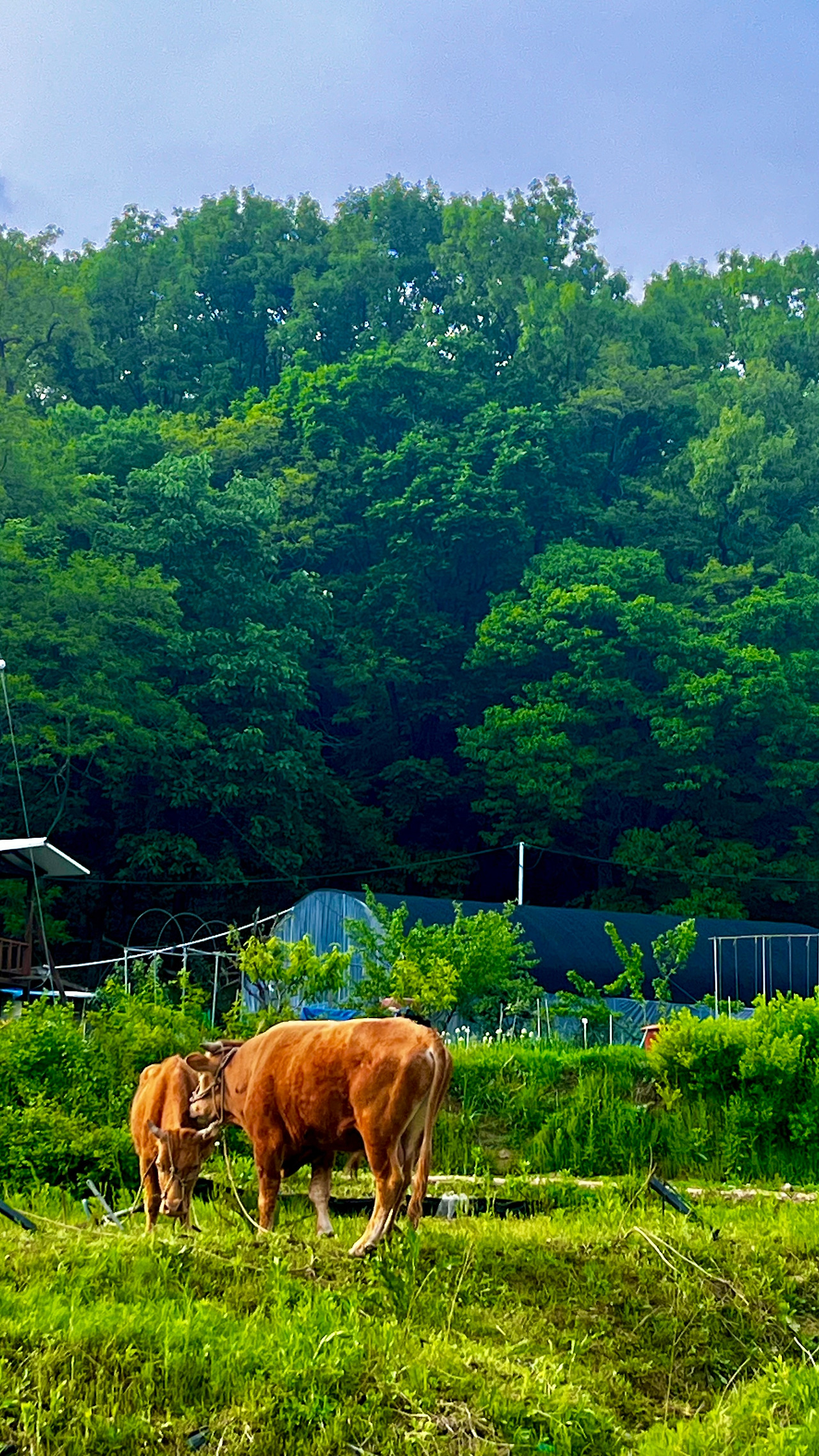 그런, 분위기를 만끽하며 돗자리를 깔고 웃통 벗고 한숨을 자고 또 다음날 오고 그랬었다. 그런 날들이 이어지는 도중에, 저~멀리에 엄청나게 큰 황소 두 마리가 풀을 뜯고 있는 모습에 혹하여서 가까이 가서 쳐다보고 있었다. 멍 하니 보고 있었는데, 또 저~멀리서 소 주인분이 ‘소 보러 왔어요?ㅎ’라며 반갑게 인사해 주셨다.
